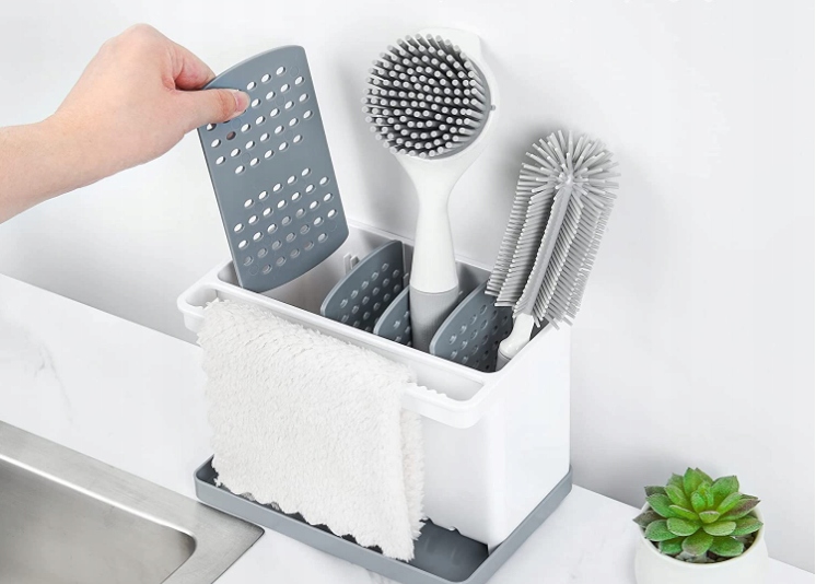 Органайзер також має дренажний піддон, який дозволяє легко стікати воді з губки та щітки для посуду. Завдяки цьому ви уникнете утворення непривабливих калюж навколо раковини, а інструменти для чищення завжди будуть готові до використання.