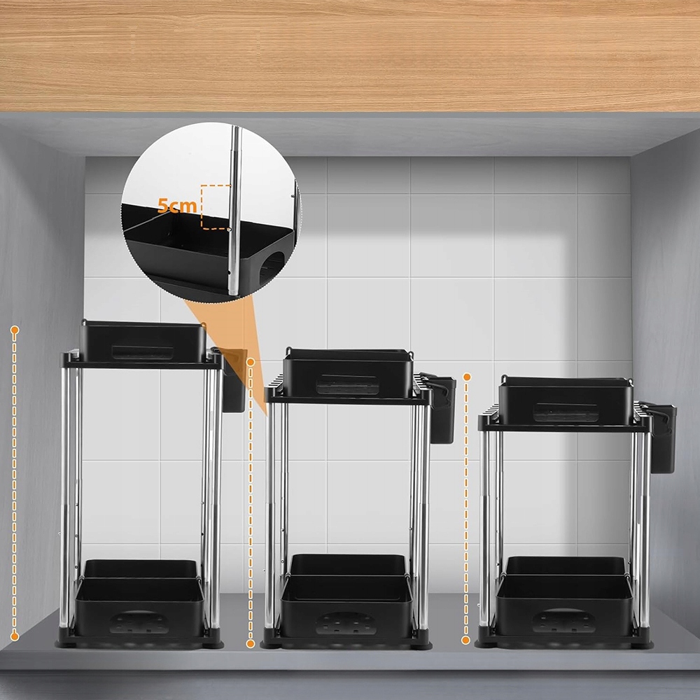 Кухонний організатор завдовжки 40 см х шириною x 30 см у висоту і висувається з можливістю регулювання висоти в діапазоні 22,5-30 мм. Вертикальний простір можна ефективно використовувати для зберігання очисних агентів, їжі, косметики тощо
