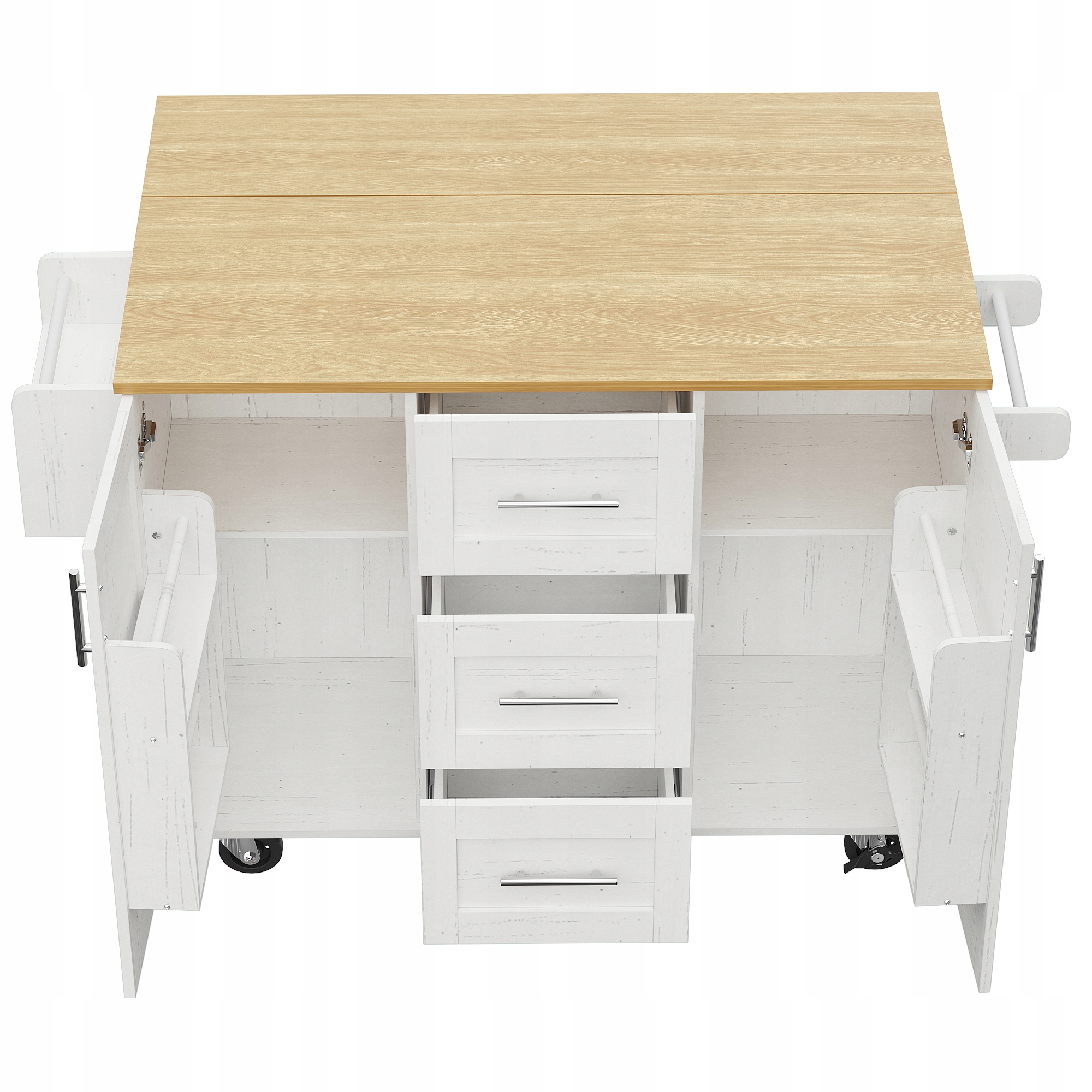 Розміри продукту: У випадку використання як кухонний острів: довжина 135 см, ширина 46 см, висота 86,6 см. У випадку використання в якості шафи: довжина 135 см, ширина 46 см, висота 87,2 см. Ця кухонна коляска має складні сторони, які можна розгорнути, щоб використовувати її як обідній стіл. Загальна довжина складених сторін після розгортання становить 74 см.