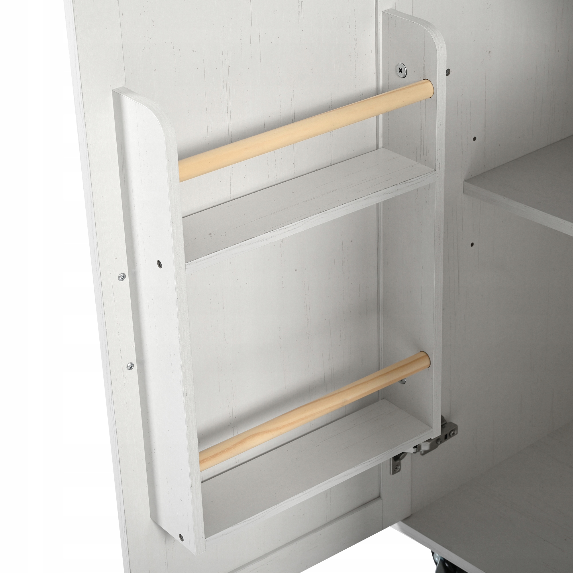 Один бік сервірувального візка має полиці для пляшок вина чи спецій, а інший бік має вішалку для рушників. Відкриваючи дверцята шафи, відкриваються подвійні полиці з обох боків, що полегшує організацію предметів і збільшує простір для зберігання.