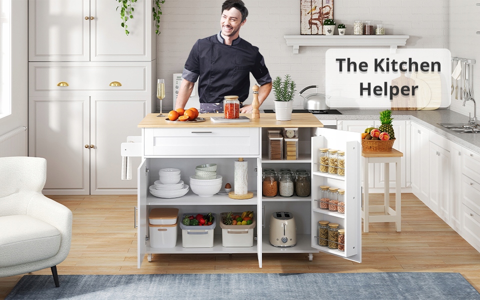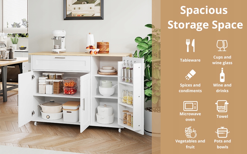 універсальні рішення для зберігання: 1. Великий ящик на вершині: оснащений тихими розсувними рейками, ідеально підходить для столових приладів або кухонних начиння. 2. Простора камера внизу: з регульованою полицею з висотою, придатною для мікрохвильовки, кавоварки або інших невеликих пристроїв. У кабінеті є дві двері для легкого доступу. 3. Поверхня шафи праворуч: дві полиці з регульованою висотою всередині та трьома сторонами на дверях, ідеально підходять для спецій та інших кухонних начиння.
