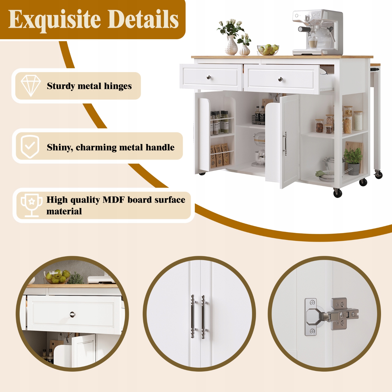 Високоякісний мобільний візок для сервірування: виготовлений із МДФ із міцними металевими петлями та блискучими металевими ручками, цей візок для сервірування поєднує в собі міцність і естетичний дизайн для вимогливих користувачів.
