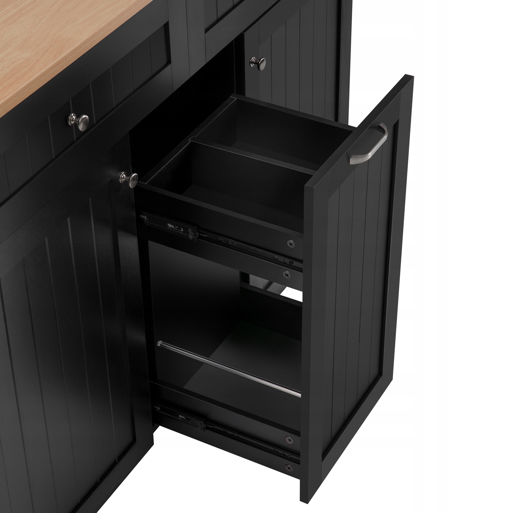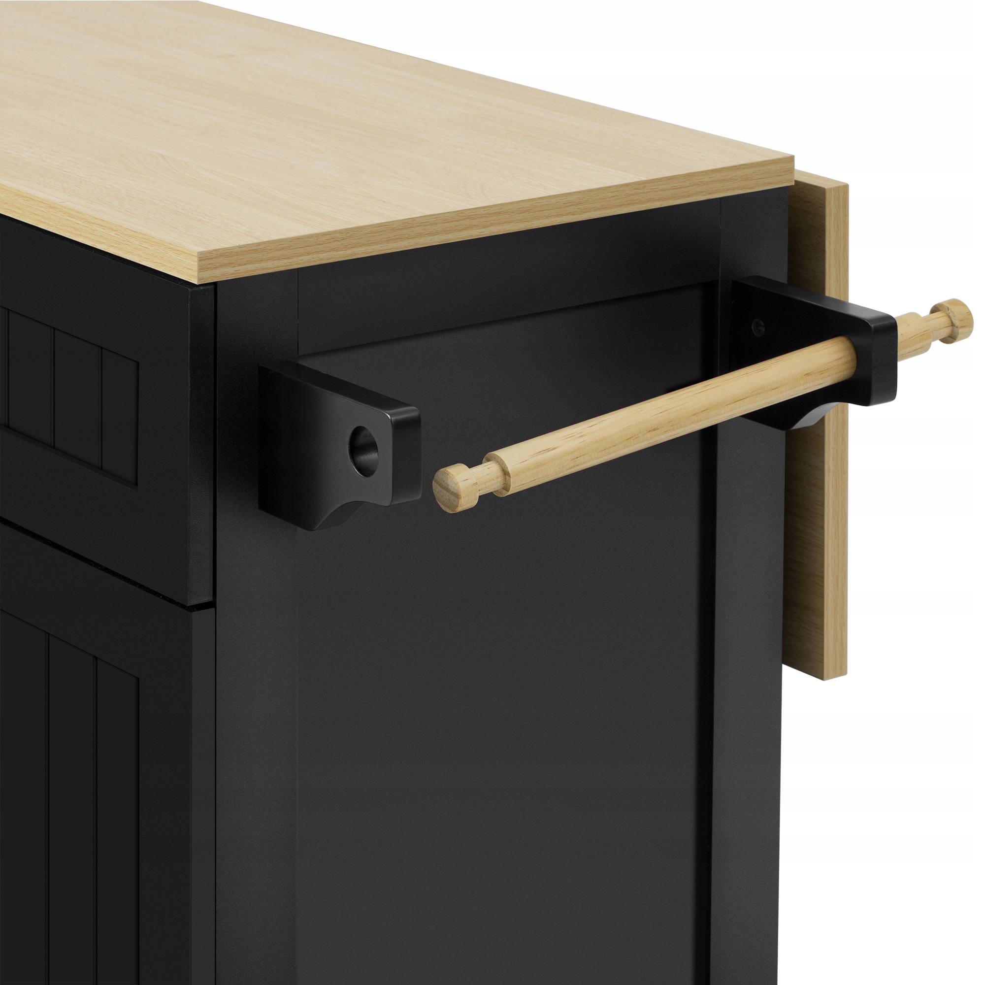 - Цей кухонний острів зі стільницею кольору дерева та чорними нижніми шафами, підкресленими металевими ручками, вражає своїм свіжим мінімалізмом. Цей кухонний острів поєднує в собі сучасну естетику з функціональним простором для зберігання: дверцята у стилі холодильника, регульовані полиці, знімну вішалку для рушників, полицю для спецій і різні ящики. Ідеальний багатофункціональний помічник для кухні та їдальні.
