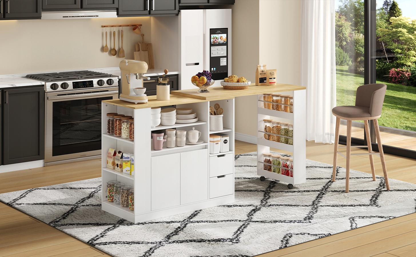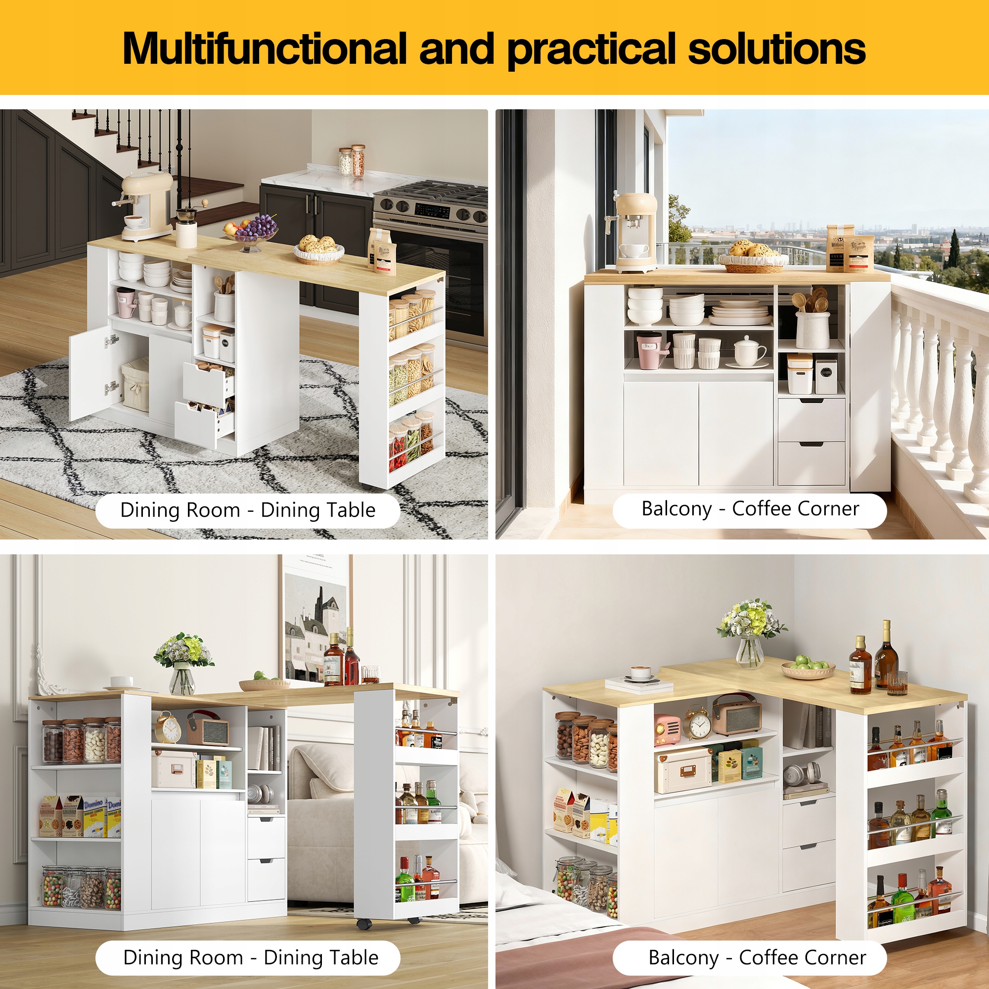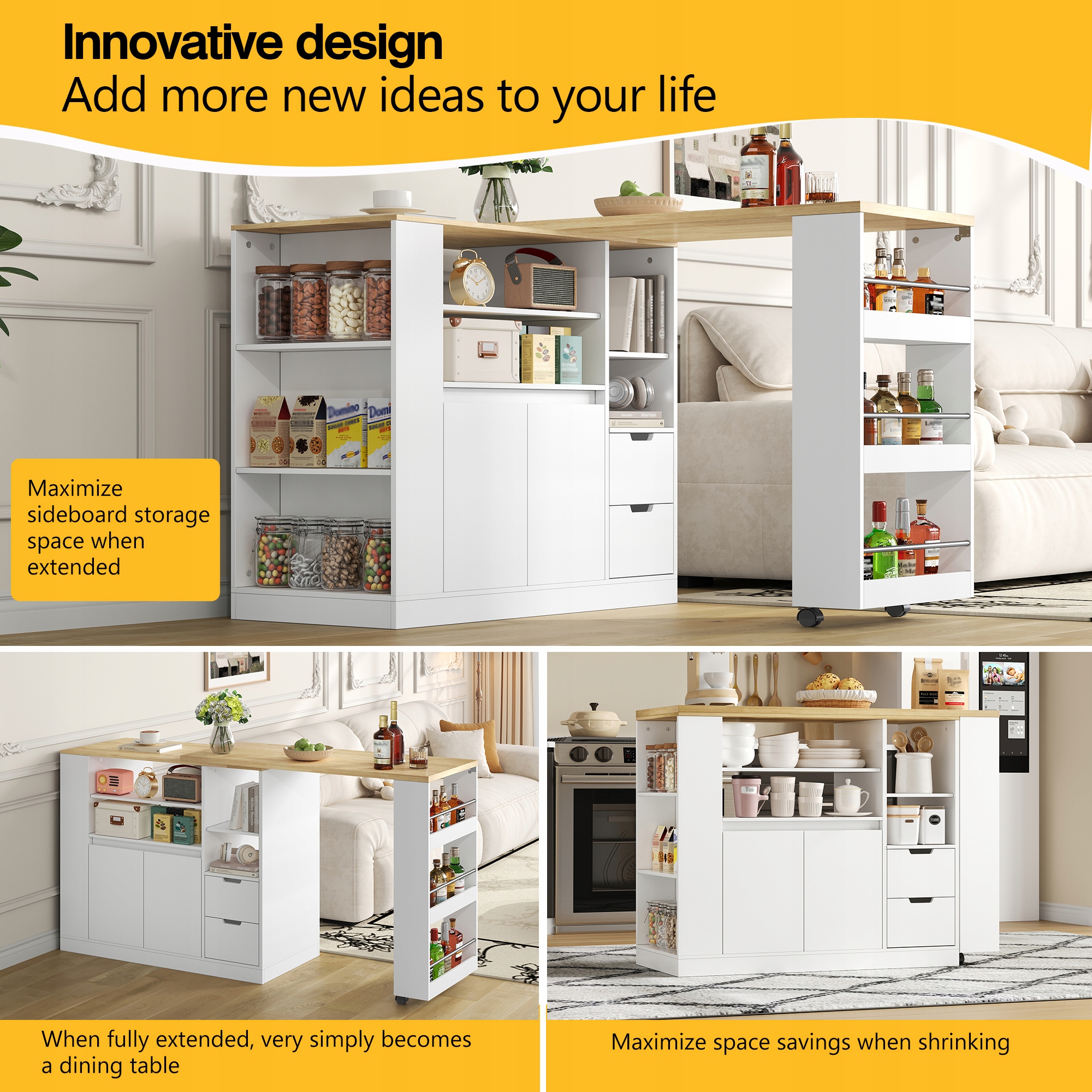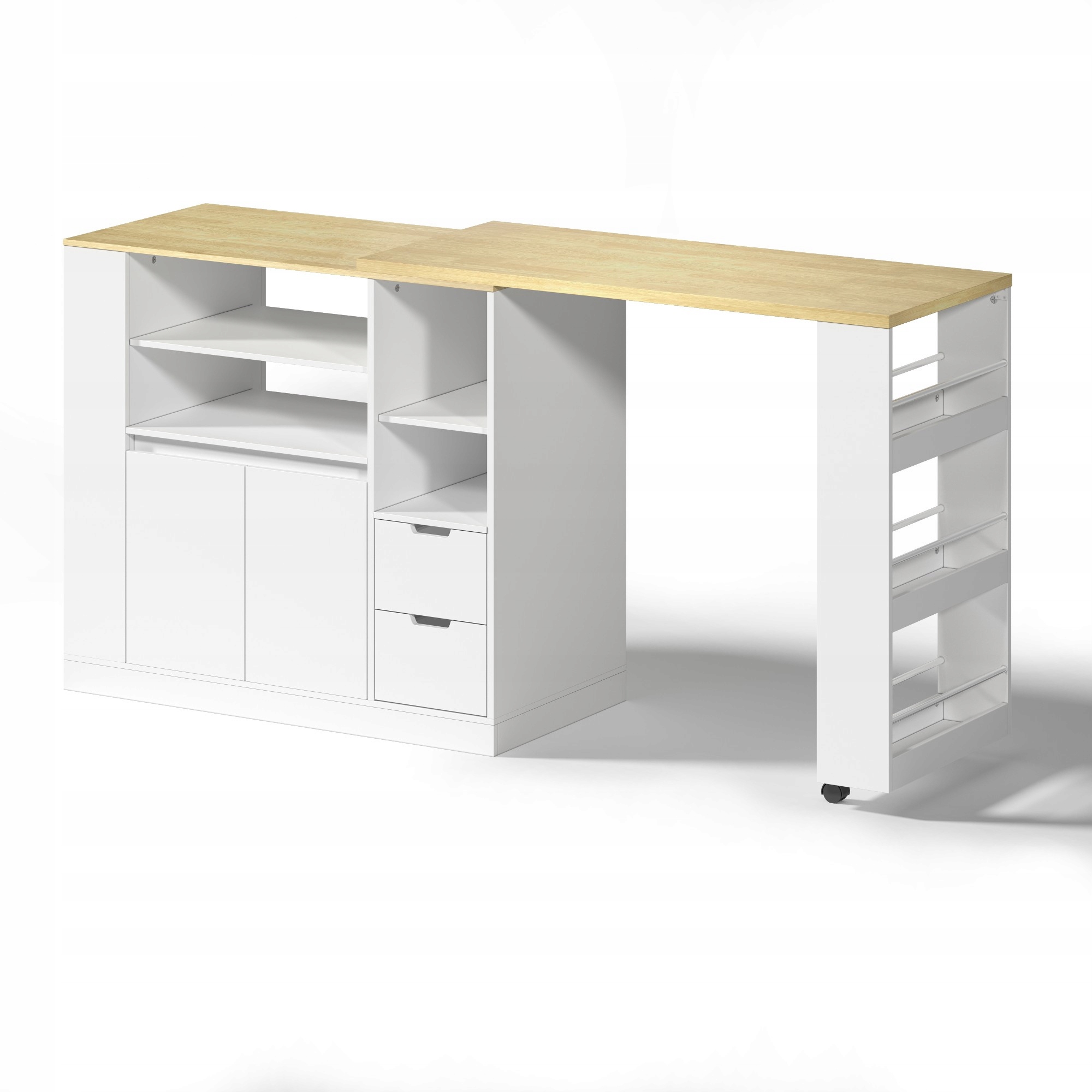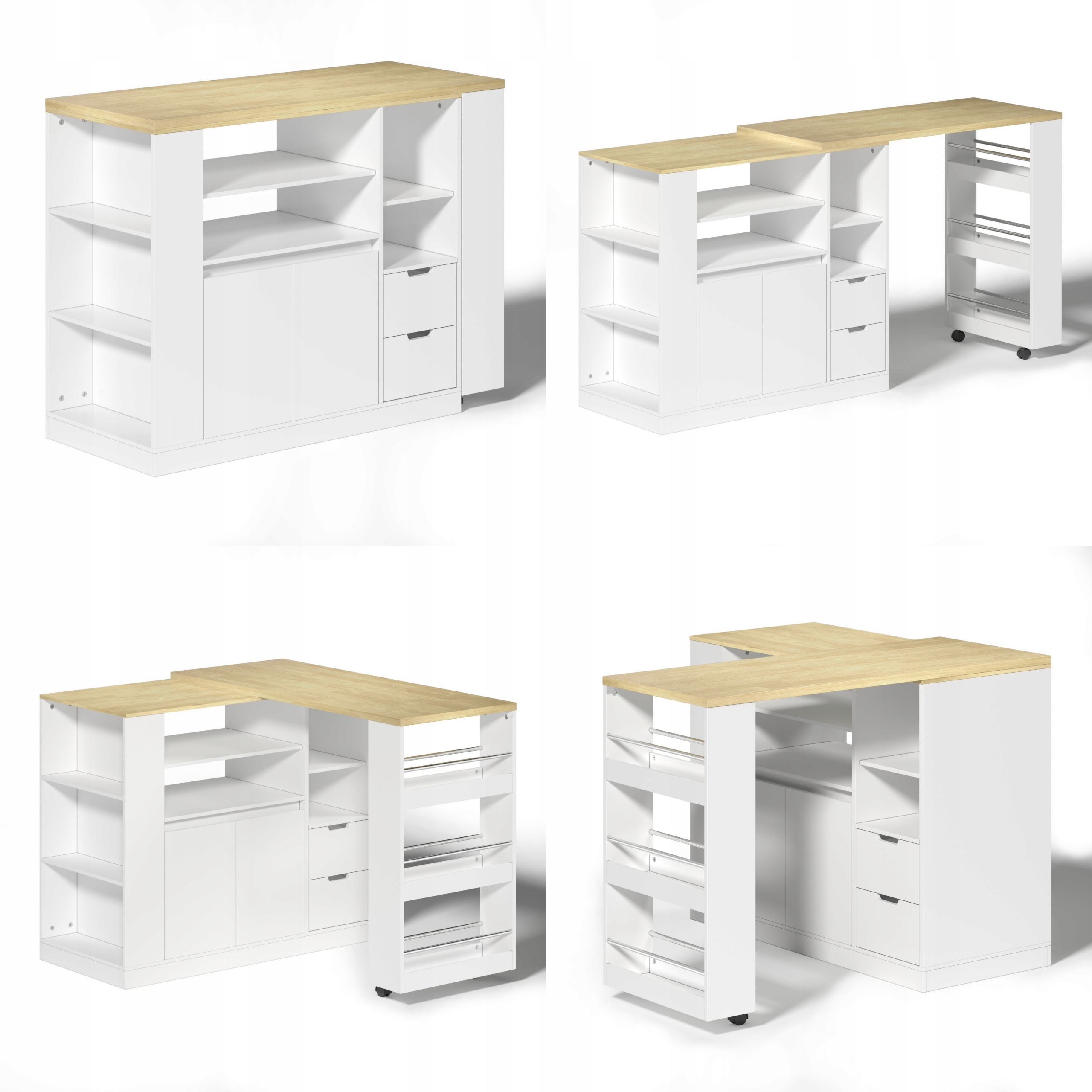 Кухонний острів із висувною верхньою поверхнею, острів для зберігання речей довжиною 115 см із тристоронніми полицями та двома висувними ящиками, кафе-бар, розсувний дерев’яний обідній стіл, підходить для їдалень та домашніх барів