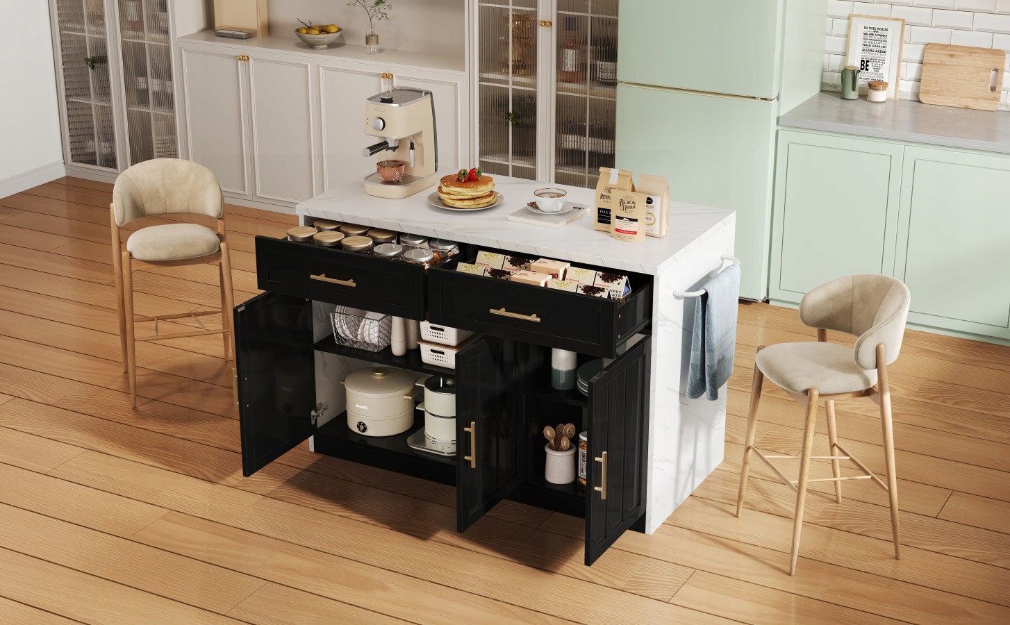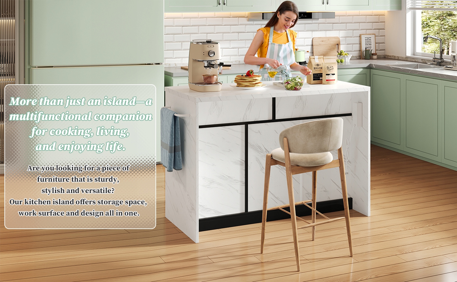Універсальні варіанти зберігання: Острів має дві ящики та три двері з регульованими поличками, пропонуючи гнучкі варіанти зберігання судин, кухні та їжі. Острів має ядро від волоконної щільності (MDF) та робочої стільниці товщиною 2,4 см за зовнішнім виглядом білого мармуру з білим меламіновим покриттям. Двері в рамці покриті екологічно чистою фарбою та оснащені елегантними металевими ручками - для довговічності, стилю та легкого догляду. Практичні особливості: інтегровані розетки в європейському стандарті на стороні острова (2 × розетки змінного струму, 2 × USB -порти, включаючи 1,5 м кабелі для кухонних приладів або зарядних пристроїв, завершені білими металевими перилами до рушників на протилежній стороні - добре роздумували для повсякденного використання. РОБОТИ, КОРОТКА АБО ДЛЯ ДОСЛІДЖЕННЯ.