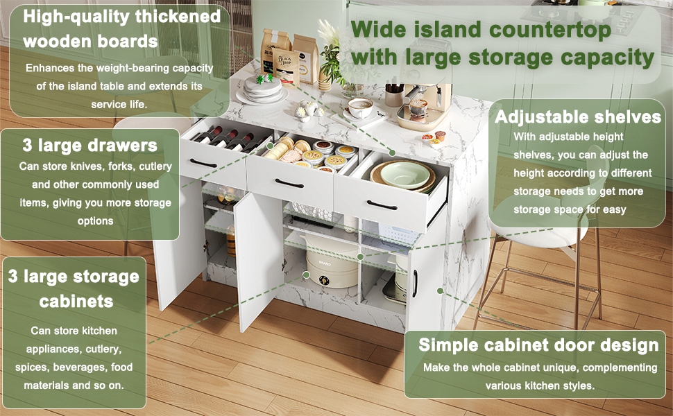 Багато місця для зберігання: Три місткі ящики (28,5 х 33 х 10 см) з низькоозумними витягнутими рейками та трьома дверима шафи (кожна з регульованими полицями) пропонують різноманітні, налаштовані місця для зберігання. Якісна технологія з м'яким закриттям: Двері шафи оснащені регульованими петлями з м'яким закриттям з нержавіючої сталі, що забезпечує плавне і тихе відкриття та закриття. Подряпини, волога та легка в очищенні поверхні, цей острів підтримує вас у всіх кухонних завданнях.