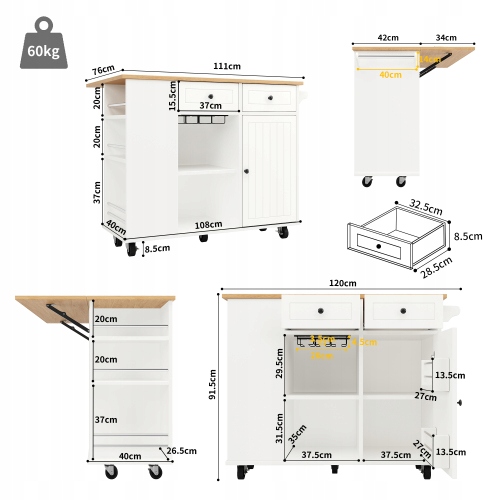 Розміри виробу: Кухонний острів має довжину 120 см, ширину 42 см і висоту 91,5 см. Боки цього кухонного візка складаються, щоб ви могли використовувати його як обідній стіл. У розкладеному вигляді загальна довжина сторін 76 см.