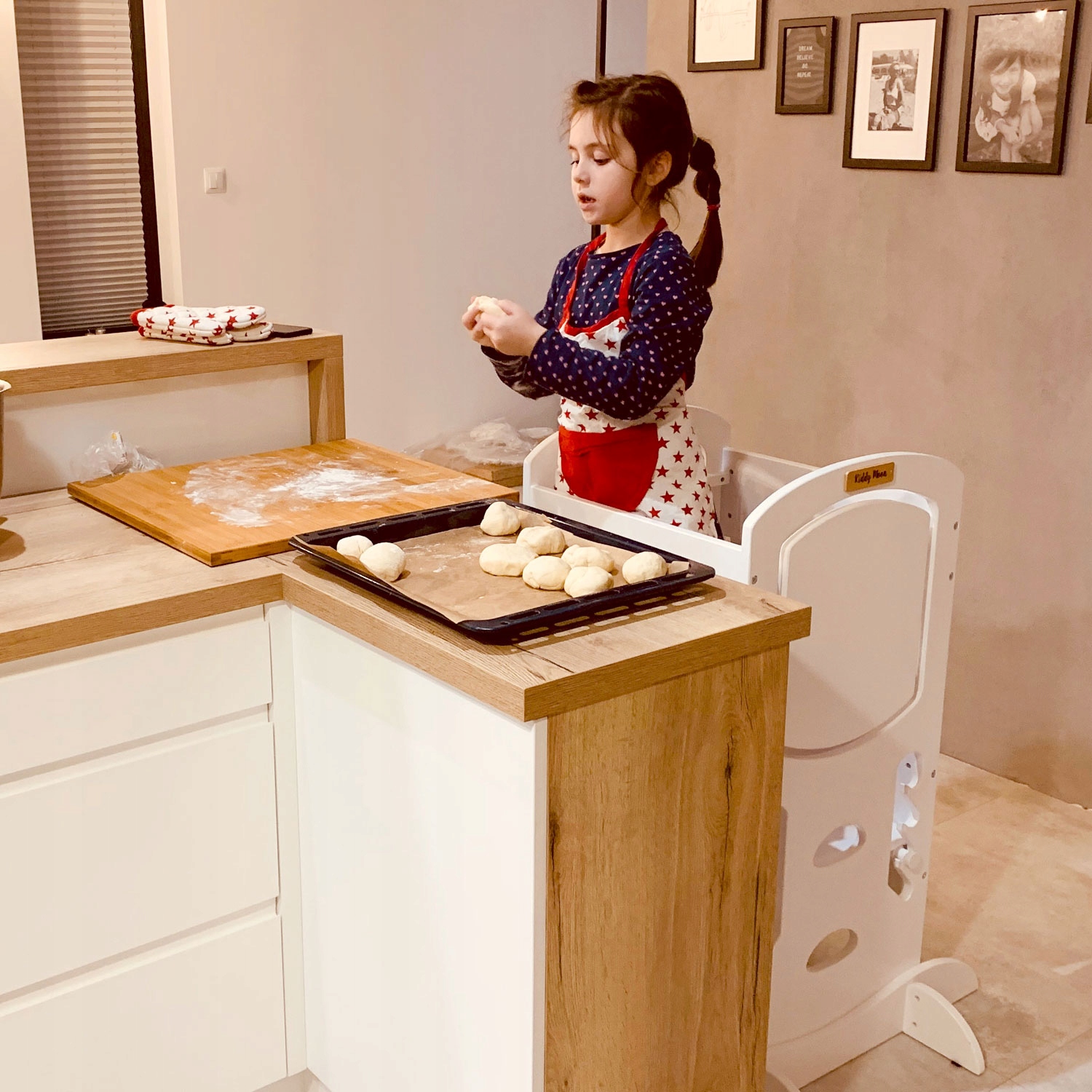 Перемішування, розминання, склеювання, розкладання - діти люблять брати участь у приготуванні страв. Помічник на кухні змушує їх відчувати себе трохи дорослими. Ваша дитина хоче допомогти вам на кухні, їй потрібно дотягнутися до раковини або стільниці, але вона все ще занизька? Помічник на кухні дозволяє дітям брати участь у таких заходах у безпечний спосіб. Завдяки цьому ваша дитина може розвивати свої ручні навички та супроводжувати вас у повсякденній діяльності, таким чином зміцнюючи природний зв'язок між дитиною та батьками. Крім того, ви уникнете того, щоб ваша дитина залазила на стільці чи табурети, звідки вона може легко впасти.