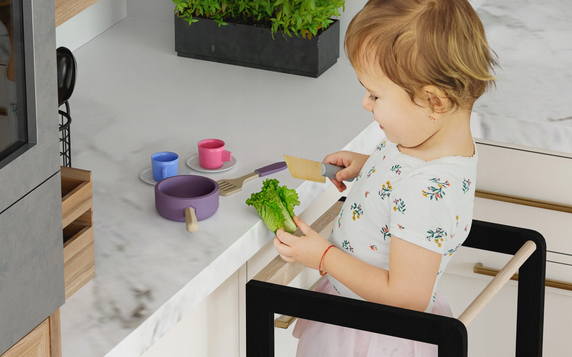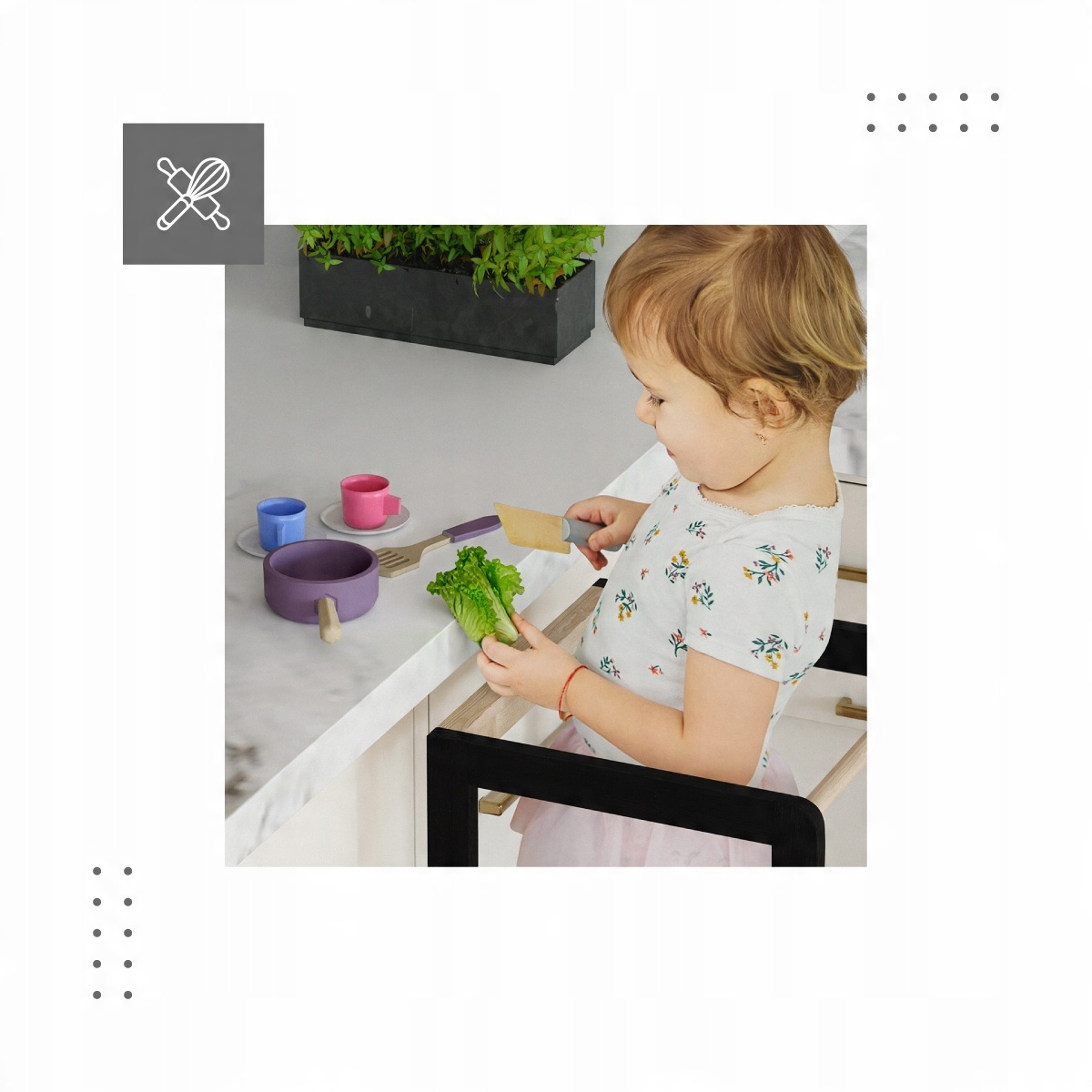 Кухонний помічник, незважаючи на назву, працюватиме не тільки на кухні. Безпечний дизайн дозволяє наймолодшим пізнавати світ і здобувати нові навички без обмежень, пов’язаних із зростанням. Tasty 20 полегшить малюкові мити руки, зуби чи поливати квіти.