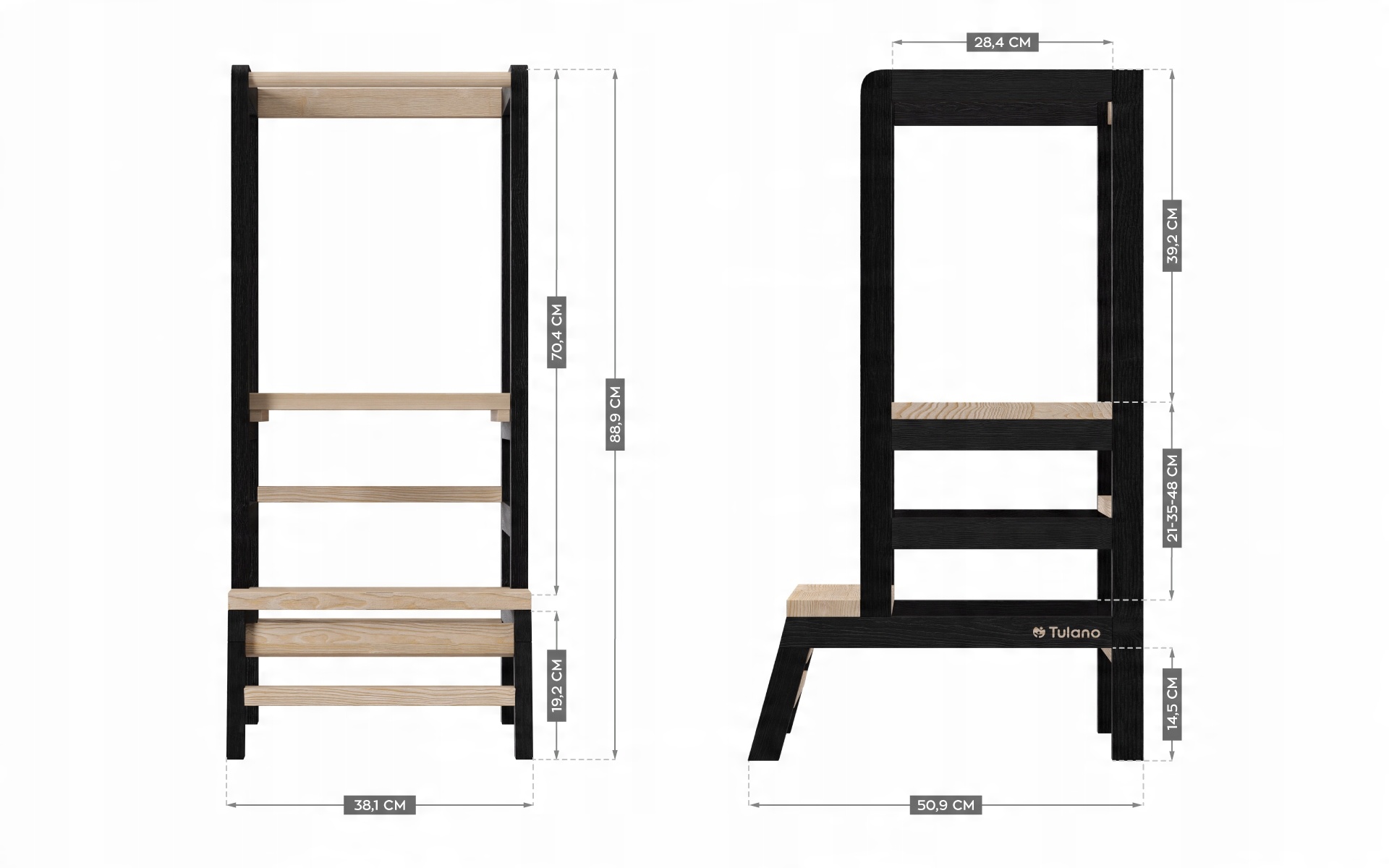 - 3-ступеневе регулювання висоти платформи: 21 / 35 / 48 см дозволяє кухонному помічнику рости разом з дитиною.