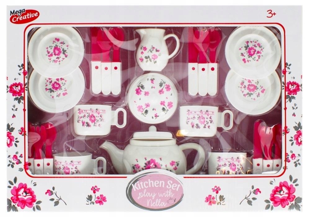 Переваги товару: розвиває творчі здібності дитини, дозволяє дитині стати дорослою і виконувати елементарні побутові дії, такі як приготування кави або чаю. Кухонний набір MEGA CREATIVE ідеально підходить для гри з приготуванням смачного чаю чи кави. Така багата комплектація красивих чашок і глечиків здатна перетворити вечірку в справжнє приємне чаювання! Комплектація: глечик, молочник, цукорниця, 4 чашки, 4 тарілки, столові прибори. Розміри/вага/батареї: розміри продукту (довжина x висота x глибина) [см]: чайник 17x10x8, розміри упаковки (довжина x висота x глибина) [см]: 46x32x8, вага продукту без упаковки [кг]: 0,25 кг, вага продукту в упаковці [кг]: 0,46 кг, не потребує батарейок. Іграшка призначена для дітей від 3 років.