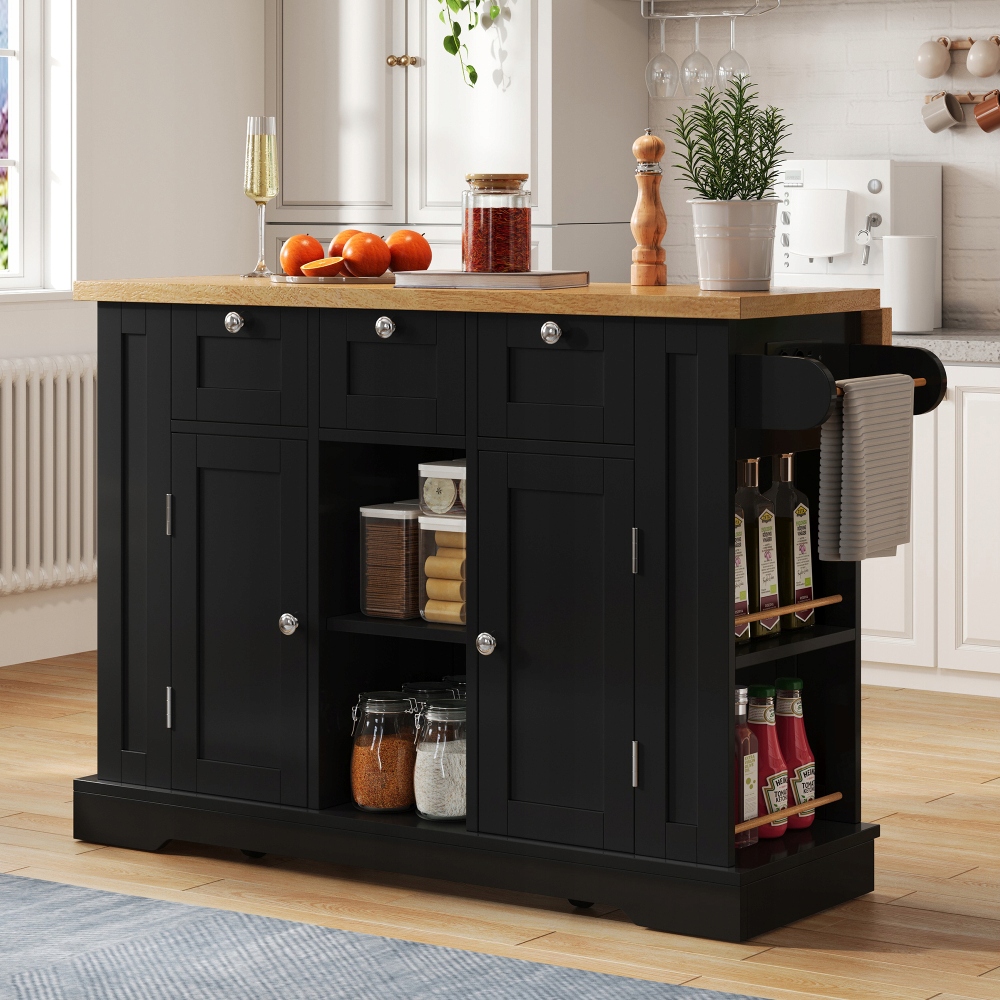 ✅ Універсальне зберігання для організованої кухні: Цей мобільний кухонний острів має 3 шухляди, 2 відділення для шаф із дверцятами та відкриті полиці з обох боків. Ідеально підходить для зберігання столових приладів, спецій і кухонного начиння. Вбудовані полиці в дверцятах шафи забезпечують додатковий простір для пляшок або невеликого кухонного начиння.