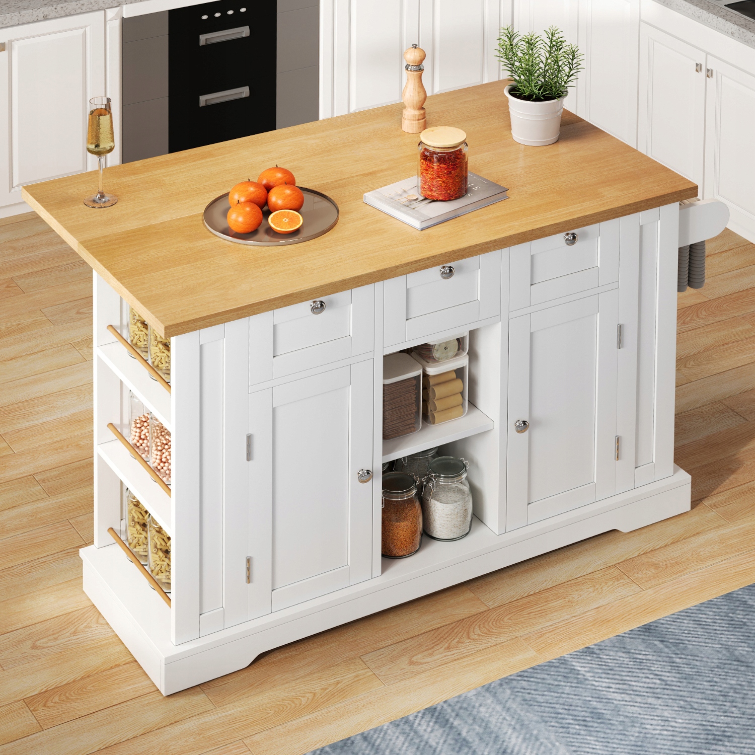 - Цей портативний кухонний острів має 3 шухляди, 2 шафи з дверцятами та відкриті полиці з обох боків, що робить його ідеальним для зберігання посуду, спецій і кухонного начиння. Інтегровані полиці всередині дверцят шафи також забезпечують додатковий простір для зберігання пляшок, банок та інших невеликих кухонних предметів.