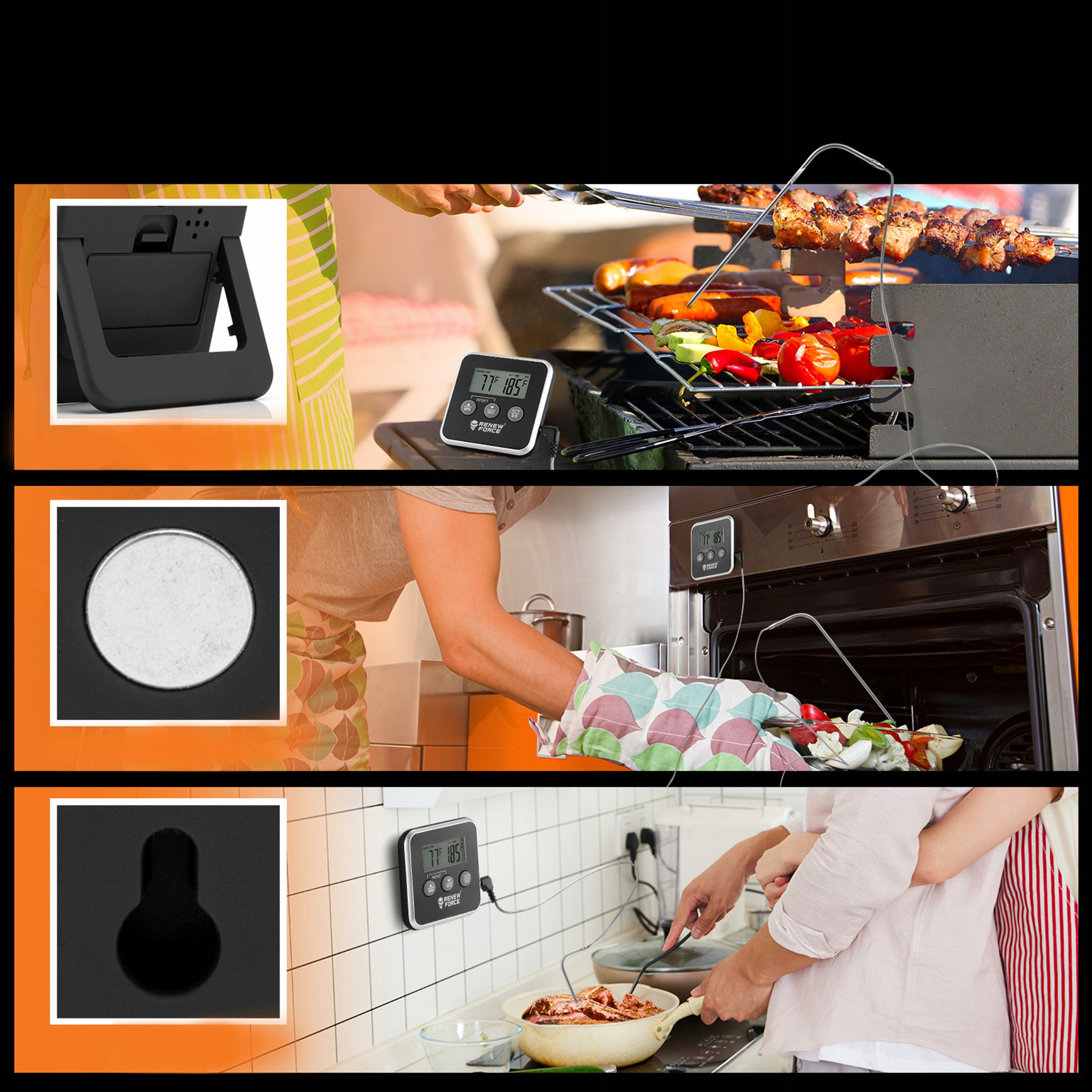 Завдяки магніту ви можете прикріпити пристрій до металевих поверхонь, а складна підставка дозволяє розмістити його на столі чи стільниці. Дротовий зонд дозволяє вимірювати температуру в реальному часі, не відкриваючи духовку чи гриль.