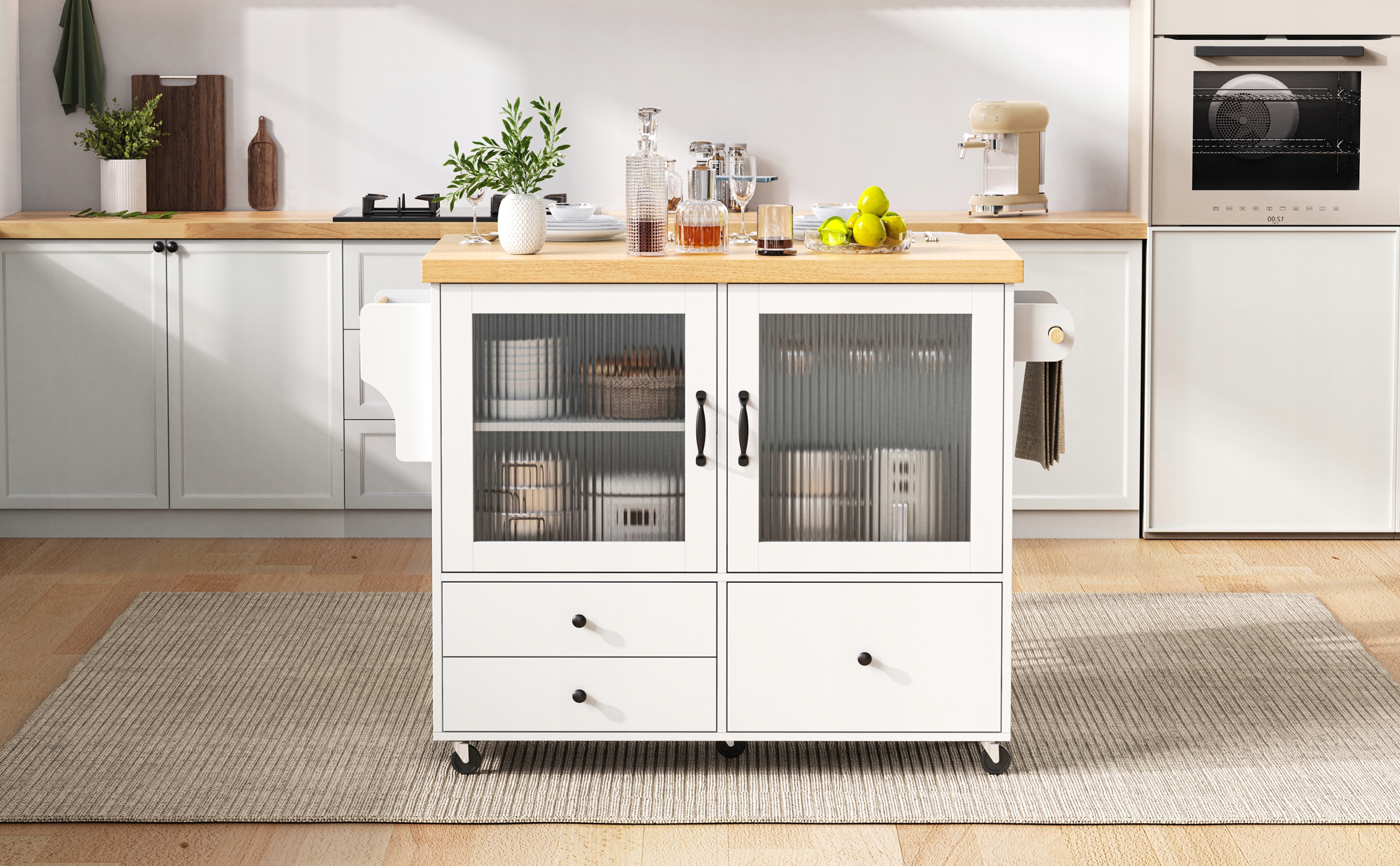 Подвійна мобільність і стабільність: розроблений із п’ятьма поворотними коліщатками (включно з двома коліщатками з фіксацією), острів легко ковзає в будь-який куток кухні. Після встановлення він надійно залишається на місці, пропонуючи стабільну та міцну поверхню, виготовлену з високоякісних матеріалів для тривалого використання.