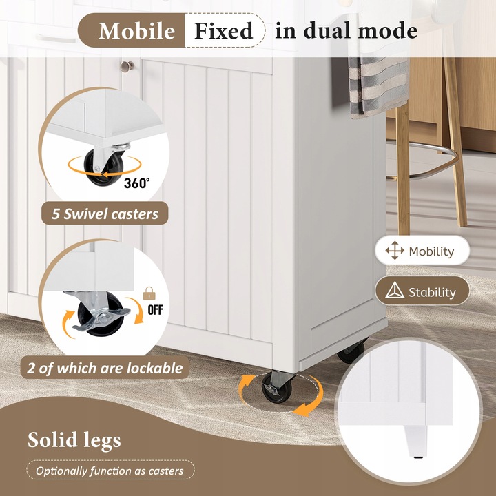 П'ять поворотних коліщаток (два з гальмами) дозволяють легко переміщати та розміщувати будь-де на кухні. Для постійної установки замініть колеса міцними дерев’яними ніжками для додаткової стабільності. Виготовлений із високоякісних матеріалів, цей острів гарантує тривалу роботу та щоденну надійність.
