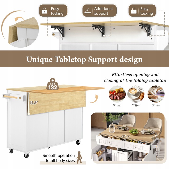 Острів, оснащений розкладним розширенням, забезпечує просторий робочий простір для приготування їжі та розваг. Міцна верхня частина витримує до 60 кг і легко збирається, коли вона не використовується, заощаджуючи простір і миттєво зберігаючи вашу кухню в порядку.