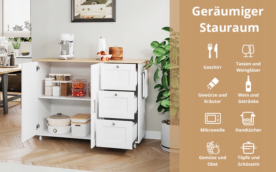 ✅ виправлення зберігання: двоповерхова шафа (з регульованими полицями) підходить для невеликих пристроїв, таких як мікрохвильова піч та кавоварка. 3 ящики праворуч оснащені тихими розсувними рейками для зберігання суден, спецій та інших предметів для задоволення різних вимог до зберігання. 4 Wyposażony W 5 Wysokiej jakości Kółek (2 Z Hamulcami), Które Wspierają elastyczny Ruch I Mocowanie, spełniają dwoje potrzeby w dowolnym miejscu i czasie. Okucia: Srebrne Metalowe Uchwyty Z okrągąą rurką i wieloregulowane Zawiay Zapewniają stabilne i płynnie działające drzwi; Ящики оснащені срібними володарями ручки, які полегшують відкриття та закриття, а загальний дизайн зосереджується на практичності та естетиці.