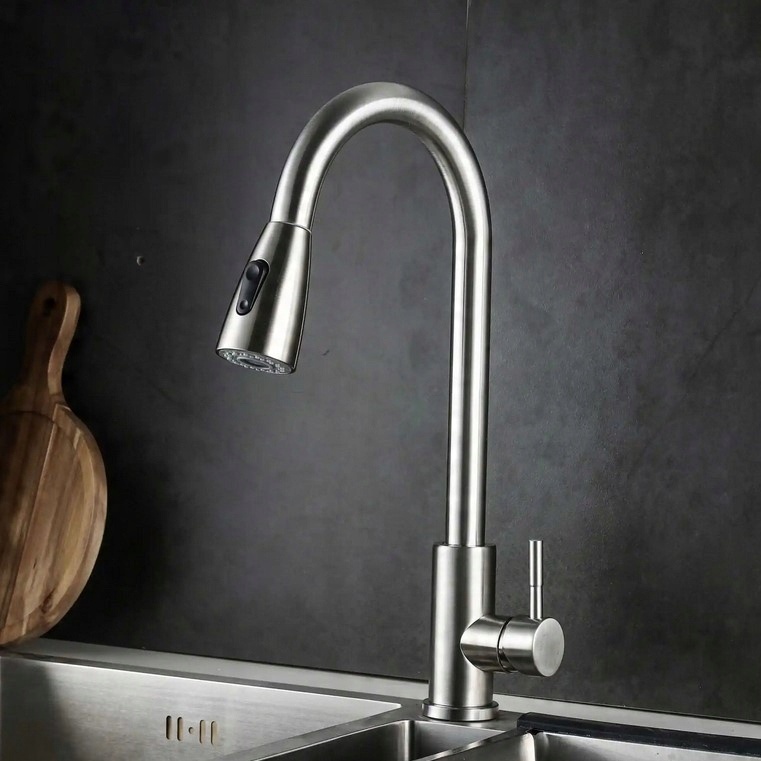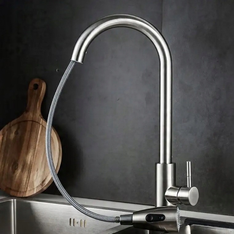 КУХОННИЙ ЗМІШУВАЛЬНИЙ НІКЕЛЬ ІНОКС, ВИСУЙНИЙ ВИЛИВ, ВИСОКИЙ ПОВОРОТ