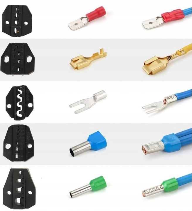 - Набір складається з щипців з автоматичним регульованим храповим механізмом і змінних плашок, адаптованих до п’яти типів електротехнічних роз’ємів. Фільтри замінюються відгвинчуванням.