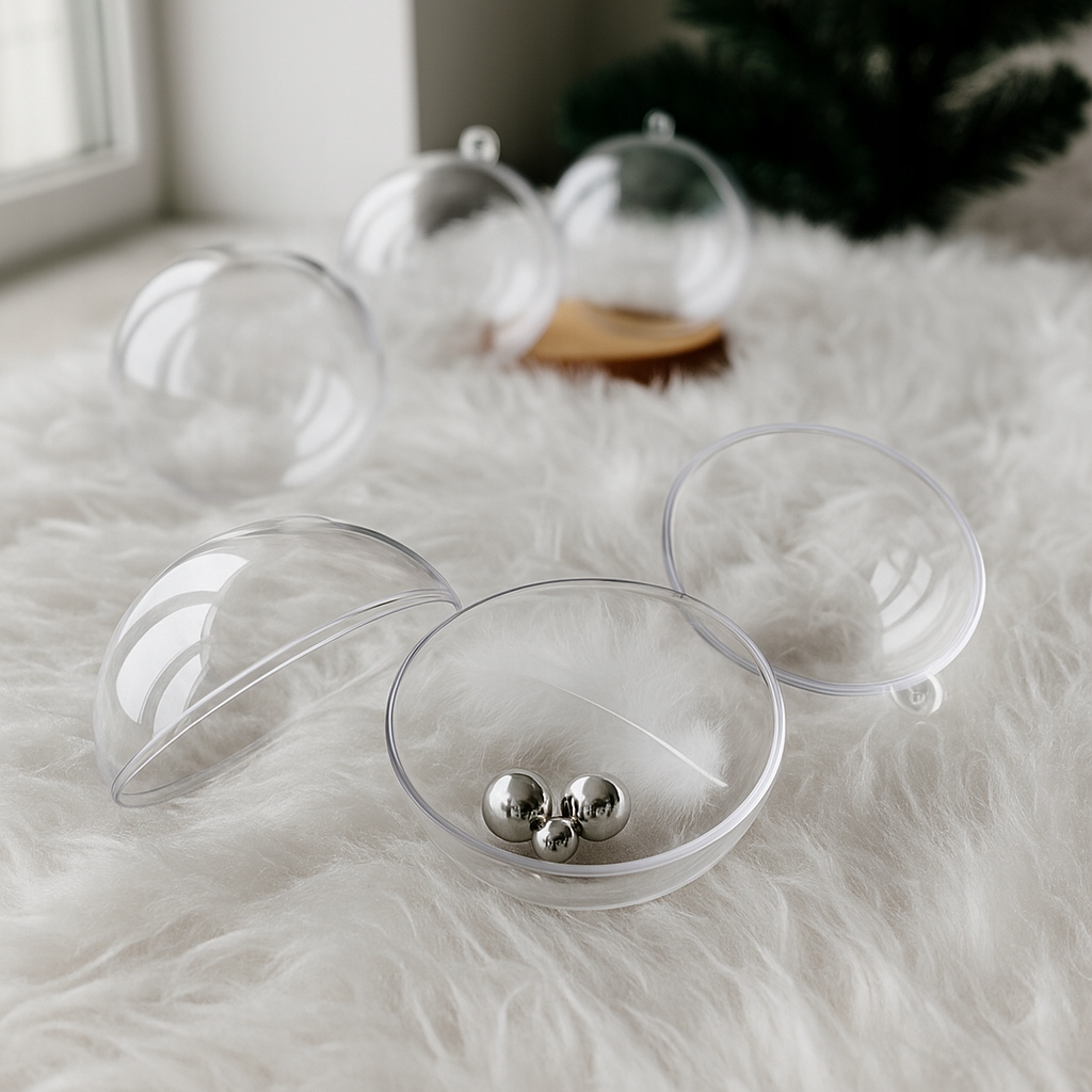 Відкрийте для себе магію творення! Прозорі акрилові кульки, що відкриваються, є ідеальною основою для створення власних унікальних прикрас. Наповніть їх ялиновими гілками, штучним снігом, сосновими шишками, фігурками або конфетті і створіть прикраси, які порадують кожного. Ідеально підходить для ялинки, прикрас, подарунків та дизайну інтер'єру!