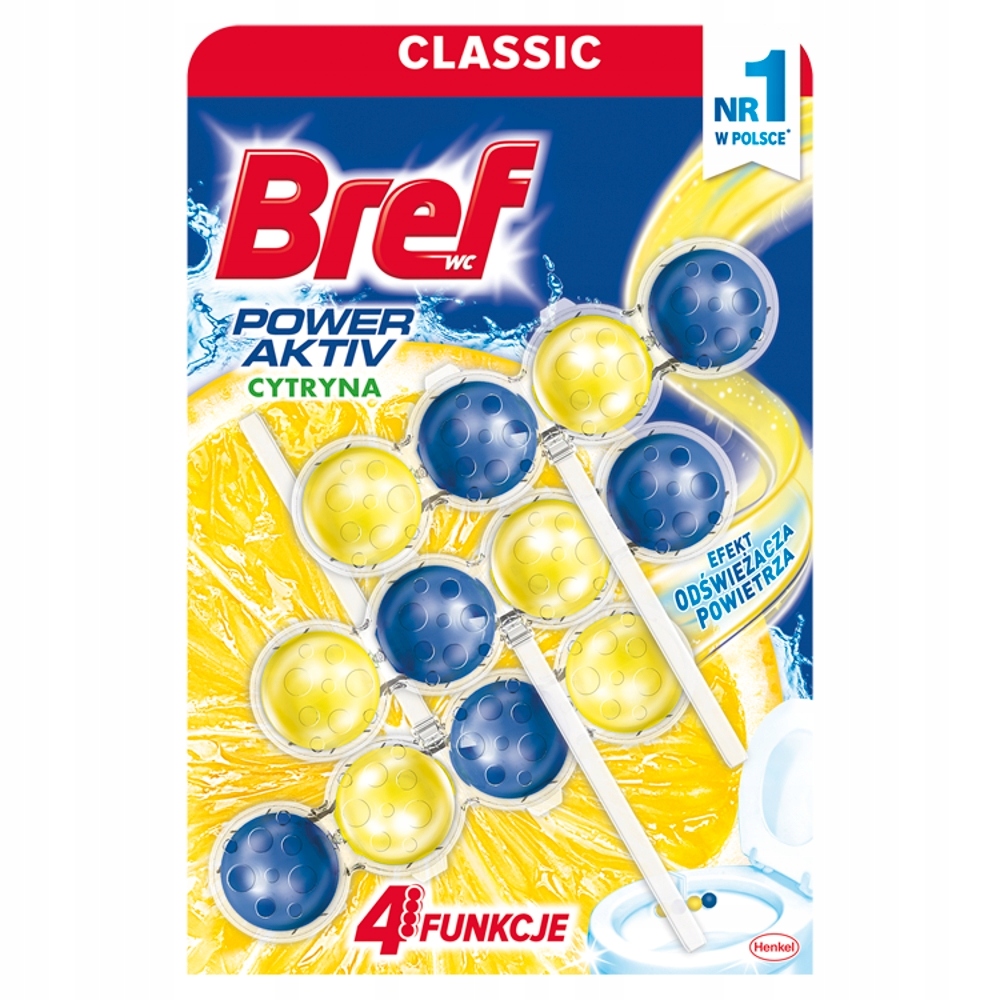 Інноваційна формула Bref Power Aktiv відповідає 4 функціям, включеним у стриманий і сучасний пакет. Нове покоління туалетних блоків запобігає утворенню вапняного нальоту та допомагає підтримувати ваш туалет чистим і свіжим, поєднуючи захист від бруду та додаткову свіжість.
