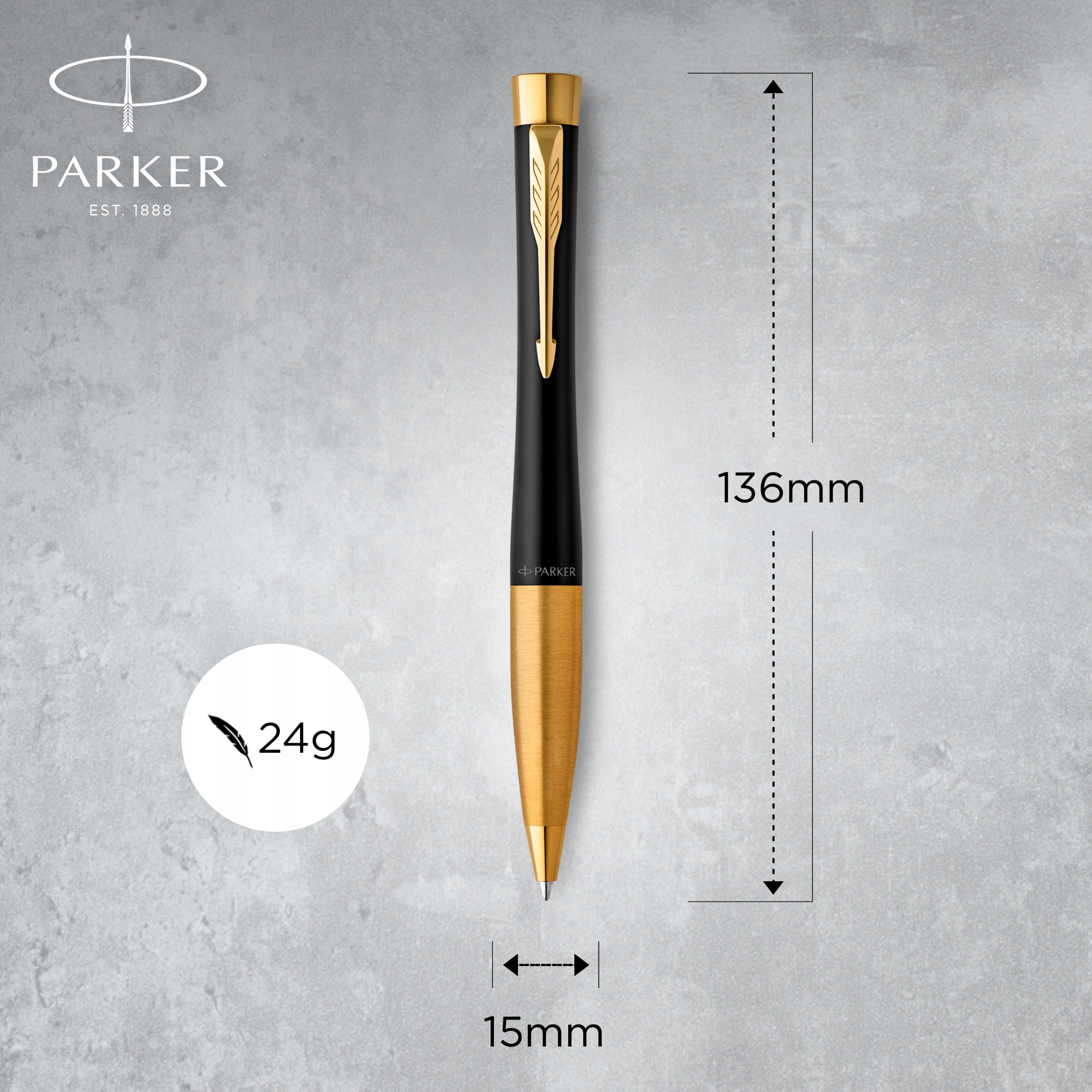 Приглушений чорний лак, злегка пудровий, із золотим оздобленням і корпусом, доповненим характерною кліпсою у формі стрілки PARKER.