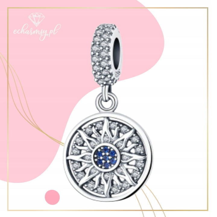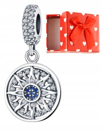 Підвіска Charms у вигляді підвісного медальйона з мотивом сонця. Верх шарму прикрашений прозорим фіанітом. Зворотна сторона намистини гладка.