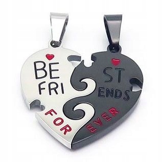Стильний, красивий кулон, призначений для пари / закоханих / друзів, повністю виготовлений з сталі хірургічної 316L, яку часто називають ювелірною сталлю, нержавіюча сталь, або нержавіюча сталь. Виріб складається з двох підвісок - половинок, які, з'єднуючись, утворюють Серце. Незважаючи на те, що підвіски сумісні, їх можна носити окремо. Чорний колір однієї з підвісок - результат нанесення покриття методом стійкого IP. Передні поверхні підвісок ідеально відшліфовані, з високим глянцем. Тильна сторона має матове / матове покриття, адаптоване для персоналізації > , що зробить виріб ще більш унікальним. Підвіски містять напис «Best Friends for ever» чорного кольору та чарівних кольорів. Кулон може бути призначений для друзів/коханих, що символізує дружбу або ваші близькі стосунки. Підвіска виготовлена з особливою ретельністю та увагою до деталей з матеріалів найвищої якості, виготовлена таким чином, щоб забезпечити максимальний комфорт використання виробу. Це також ідея для ідеального подарунка.