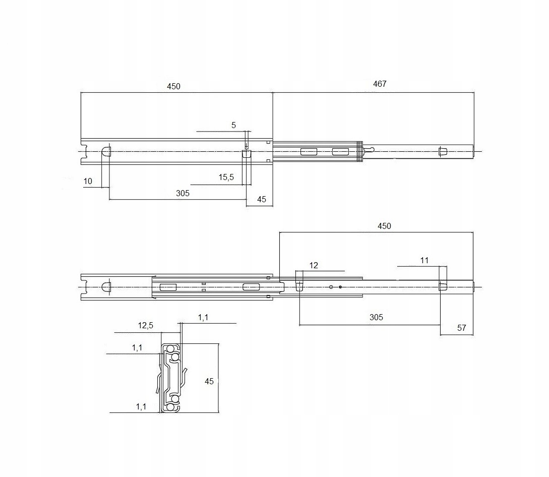 Кульовий напрям для металевих меблів з повним ковзанням та встановленням багнети з довжиною 450 мм з допустимим навантаженням 45 кг. бренд hakner