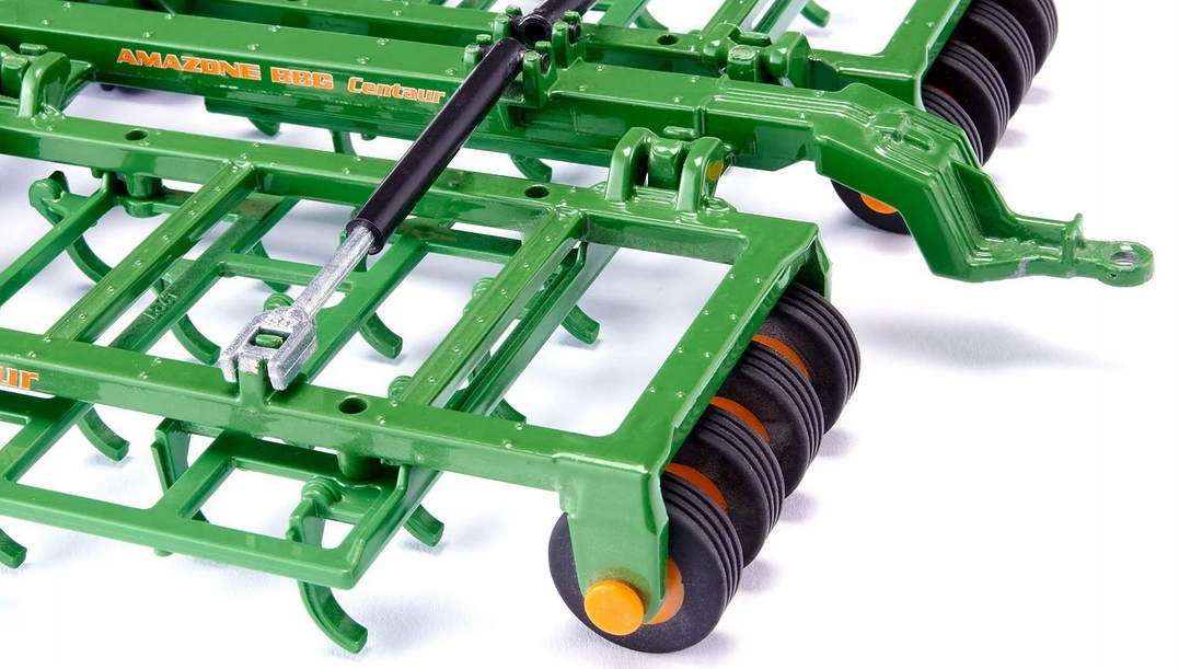 Amazone Centaur - це робочий інструмент для великих тракторів, якого не слід пропустити в жодному пристойному господарстві. Ця багатофункціональна роль для ведення сільського господарства ідеально підходить для всіх застосувань і без зусиль, що стосуються навіть найскладніших проблем: від стерні та основного вирощування до послаблення верхнього шару ґрунту та підготовки ролі для посіву. Рама цієї суцільної машинної моделі виготовлена з металу, а зуби культиватора та елементів пластикової пластикової бойки. Шини виготовлені з гумового сільськогосподарського матеріалу і забезпечують відмінну адгезію навіть у глибокому та важкому ґрунті. Щоб отримати ще більш реалістичний досвід під час гри, замішні валики можна повернути спереду і ззаду, а рамку можна скласти та заблокувати в транспортному положенні. Ця вражаюча машина доступна з оригінальним актоновим лакуванням в зеленому кольорі з помаранчевими пластиковими деталями. Складний металевий каркас