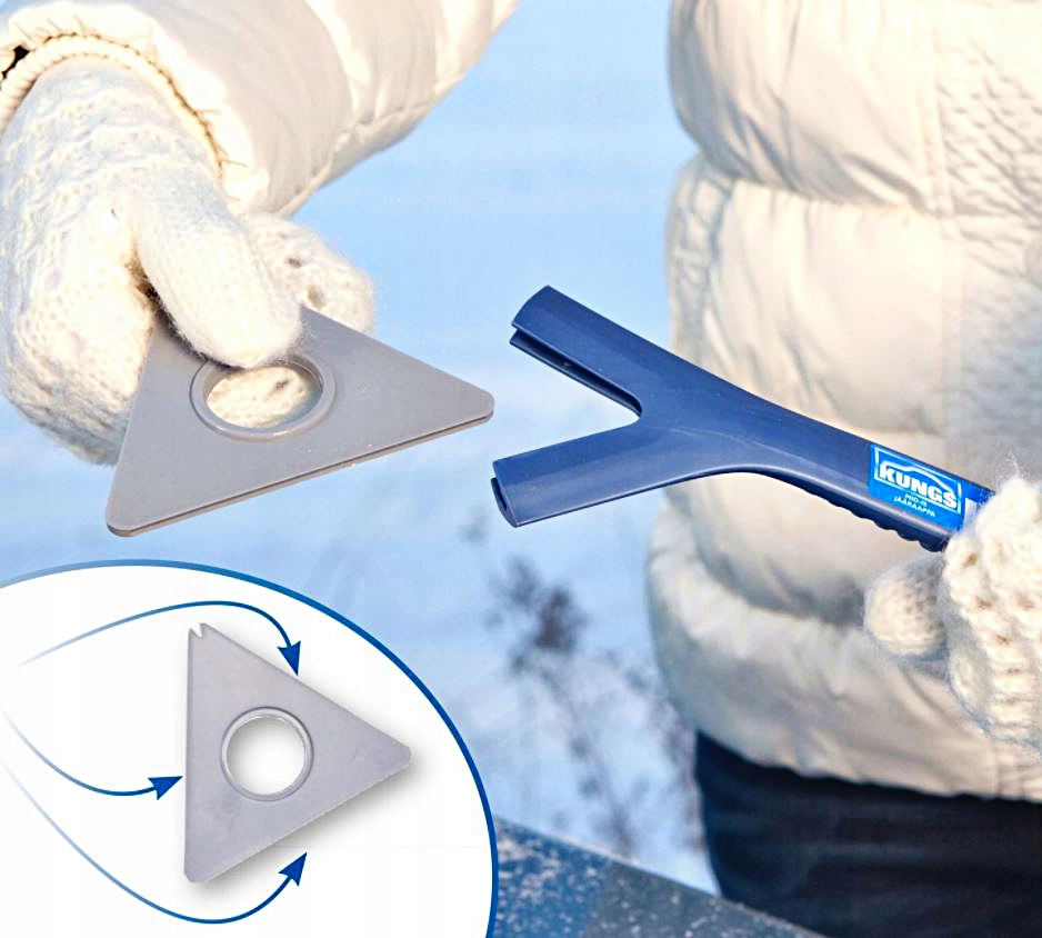 Після зняття скребка з тримача з'являються три гострі леза скребка, що значно подовжує термін служби скребка. У скребку також є виїмка, яка полегшує очищення склоочисників. Скребок для льоду можна легко зберігати в бічній кишені дверей автомобіля або в бардачку.