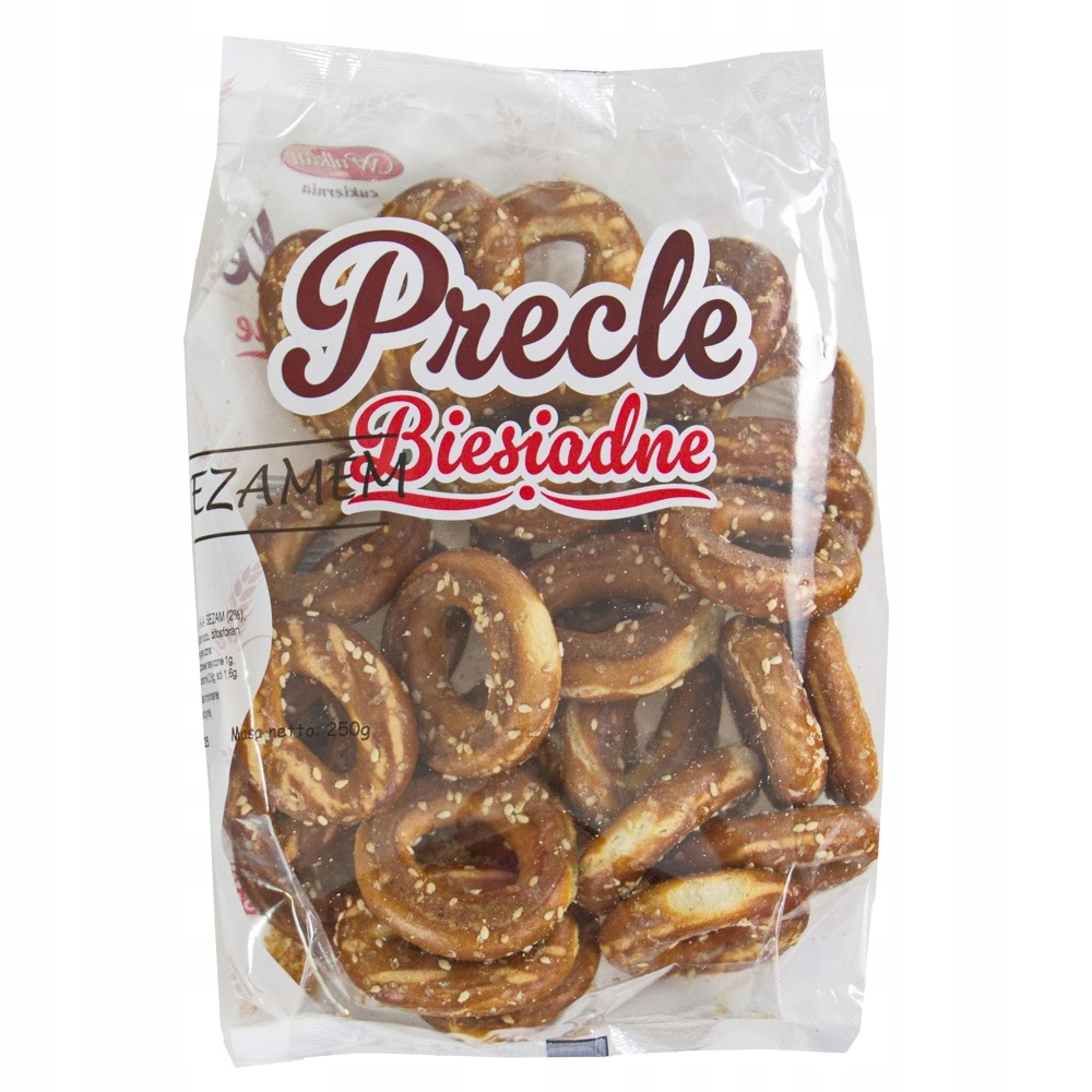 Святкові кренделі з кунжутом - чудова пропозиція для любителів хрустких закусок. Кожна упаковка вагою 250 г містить смачні кренделі, які радують їх унікальним смаком та ароматом. Завдяки додаванням кунжуту, кренделі отримують не лише характерні, горіхові післясмак, але й харчові цінності, що впливають на здоров'я.
