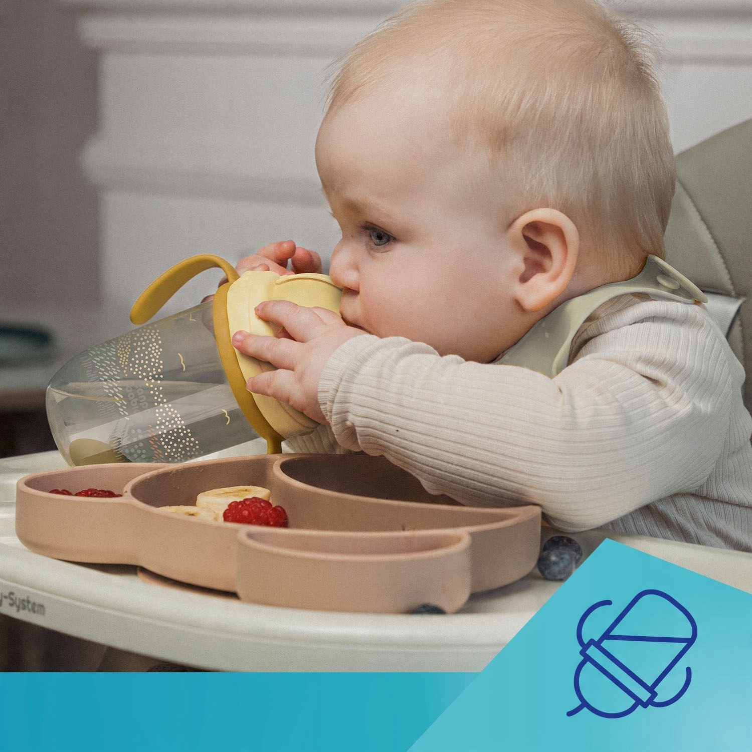 Кухоль виготовлений з пластику, що не є, не містить BPA або інших шкідливих речовин. міцний, легкий і стійкий до падінь. Зручні ручки полегшують дитину утримувати чашку, а великий отвір полегшує заповнення та миття.