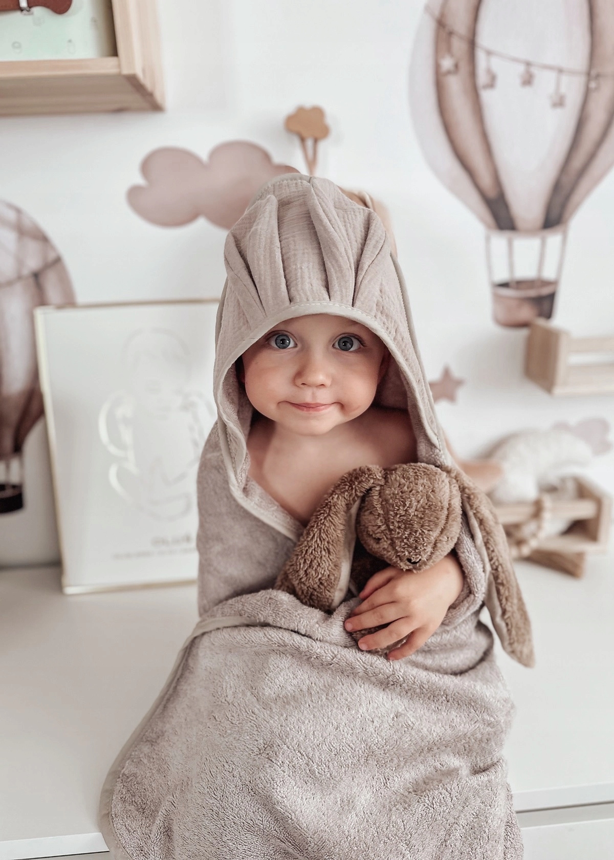 Рушник доповнено легким капюшоном з м’якого мусліну, обробленим чарівними декоративними вушками, які надають чохлу неповторного шарму. Це маленька деталь, яка робить кожну мить після ванни ще приємнішою та наповненою ніжністю.