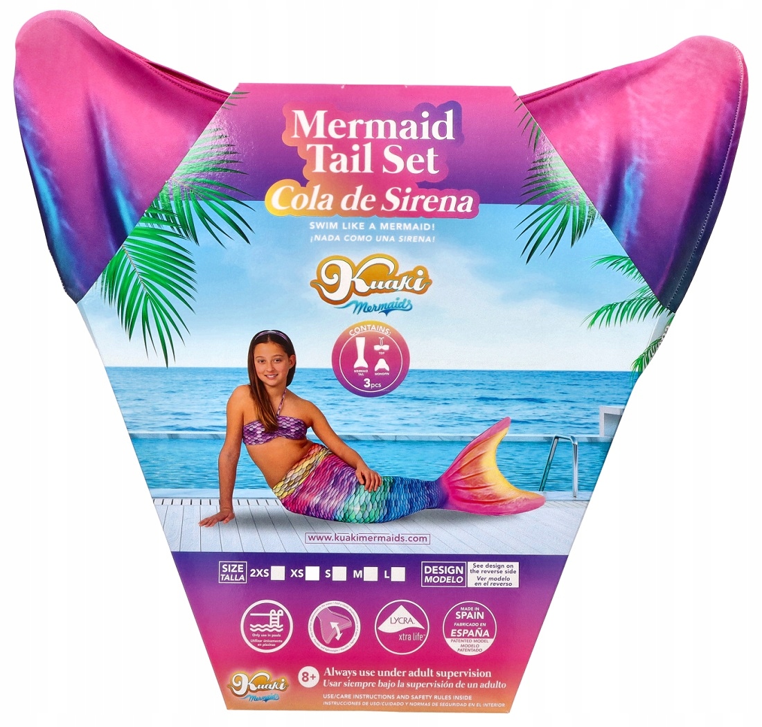 Хвости русалки бувають різних кольорів (також для хлопчиків) і з верхом бікіні або без нього. Набір із трьох частин включає: