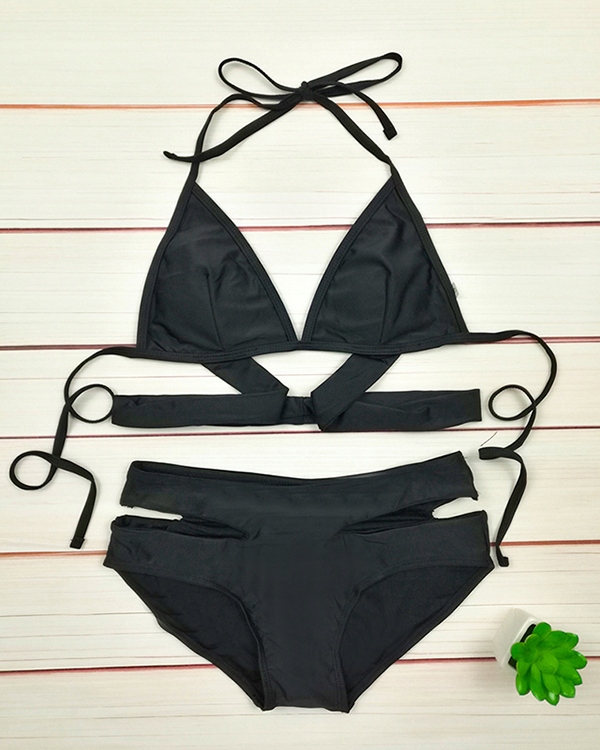 Верх у формі трикутника з сексуальними вирізами та лямками, які зав’язуються навколо шиї. Трусики з трохи завищеною талією і декоративним поясом на талії.