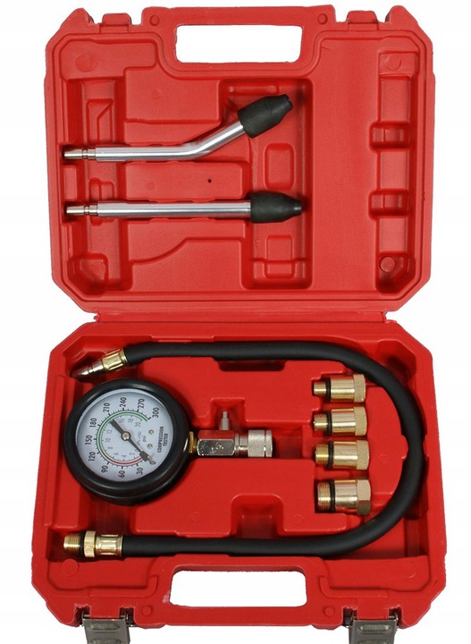 Тестер для перевірки тиску компресії в циліндрах бензинових двигунів з обладнанням, що розширює його можливості . Пластиковий кейс містить манометр з вентилем, прямий і зігнутий подовжувач, подовжувач напірного шланга і 4 перехідника для підключення до балонів. Деталі оснащені швидкими з’єднувачами для простого та швидкого встановлення.
