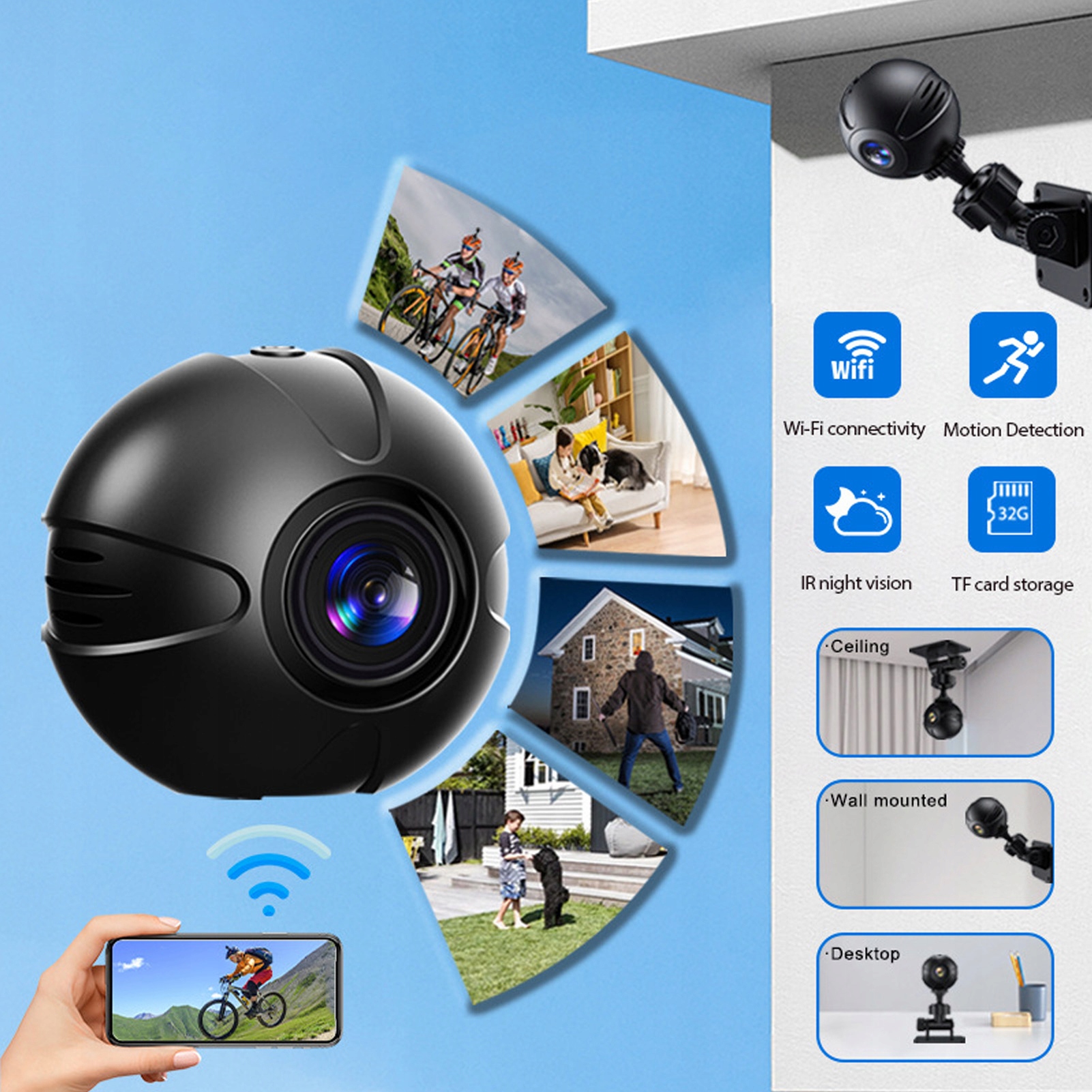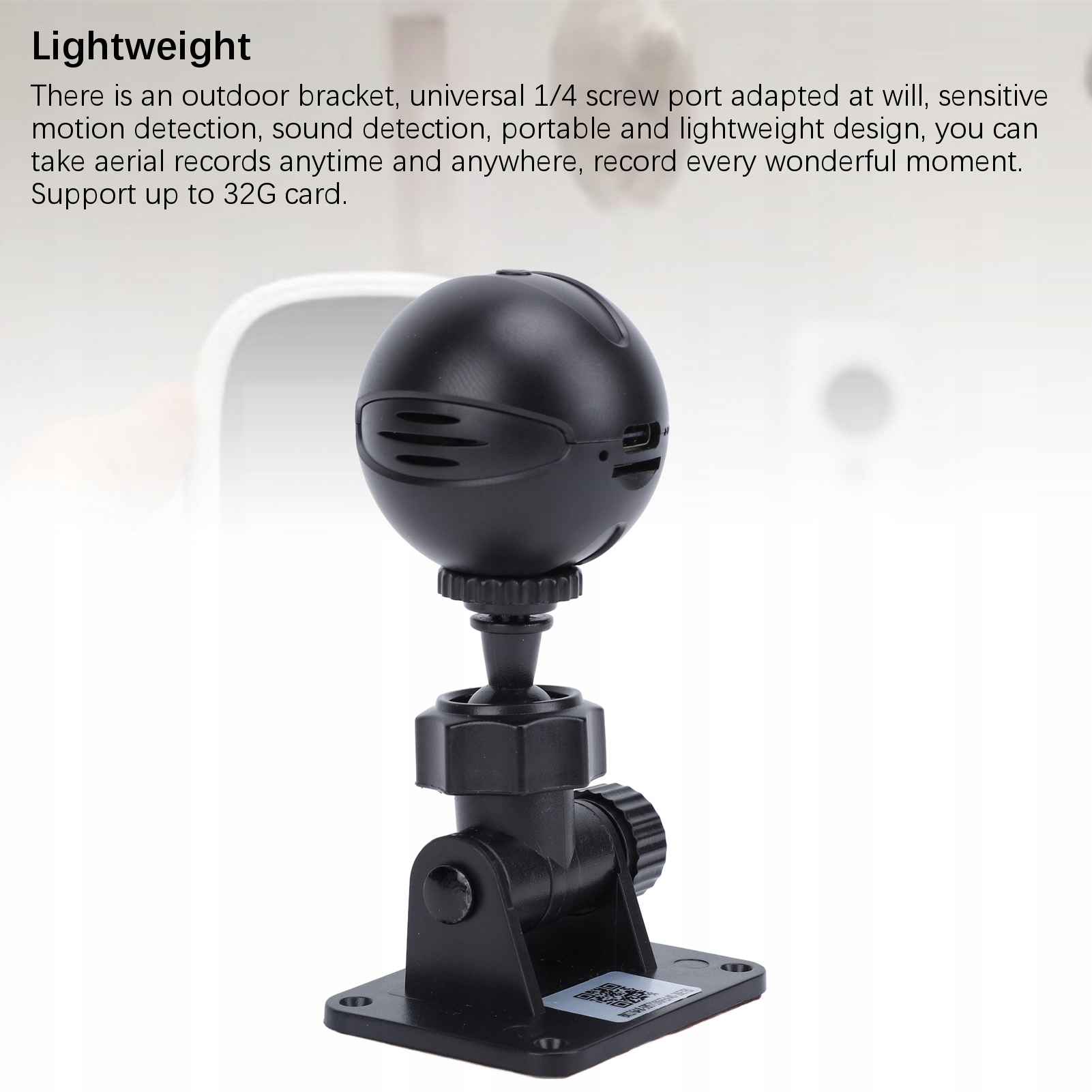 5. Легкість: зовнішнє кріплення, універсальний гвинтовий порт 1/4, який регулюється за бажанням, чутливе виявлення руху, виявлення звуку, портативна та легка конструкція, ви можете записувати аерофотозйомку будь-де та будь-коли, записуйте кожну чудову мить. Підтримка карт до 32G.