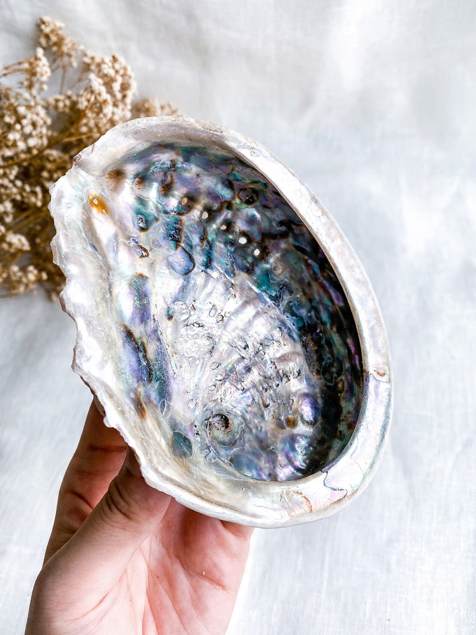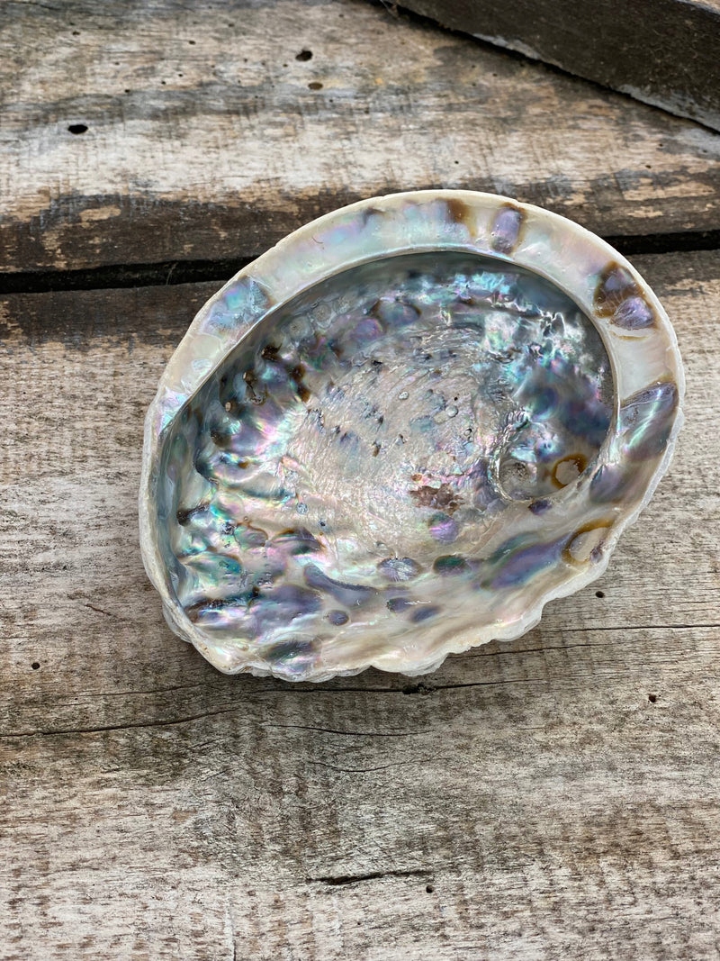 Мушля Paua Abalone Haliotis Midae — це красива мушля з райдужним перламутровим наповнювачем і натуральними неполірованими краями. Його можна використовувати як підставку для спалювання шавлії, трав, паличок Palo Santo та конічних ароматичних паличок.