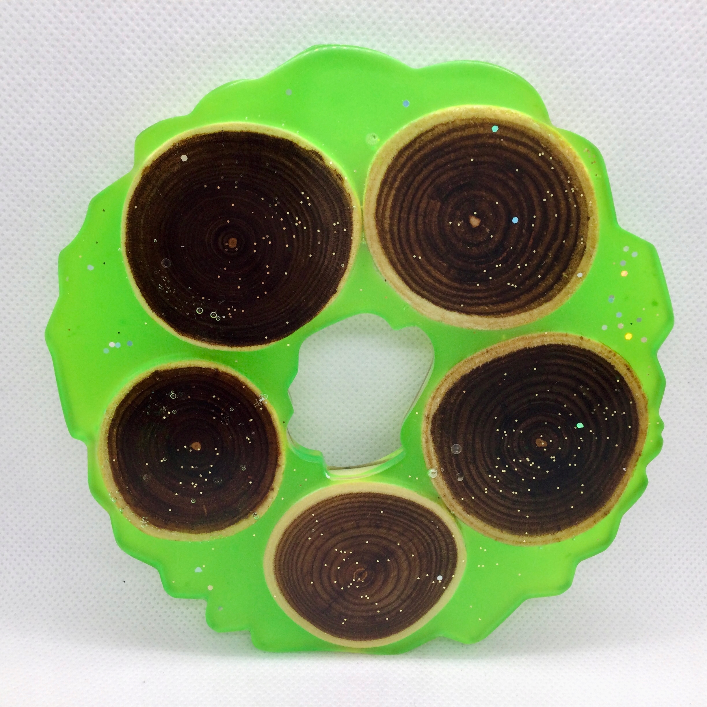 Прекрасні шматочки екзотичного дерева, вбудованого в смолу. Ці маленькі дерев’яні прокладки, хоча вони, здається, є лише невеликими деталями, несуть дух природи та простоти. Вони як пам’ять про ліс, укладені в чотири стіни, нагадуючи, що краса полягає в природності.
