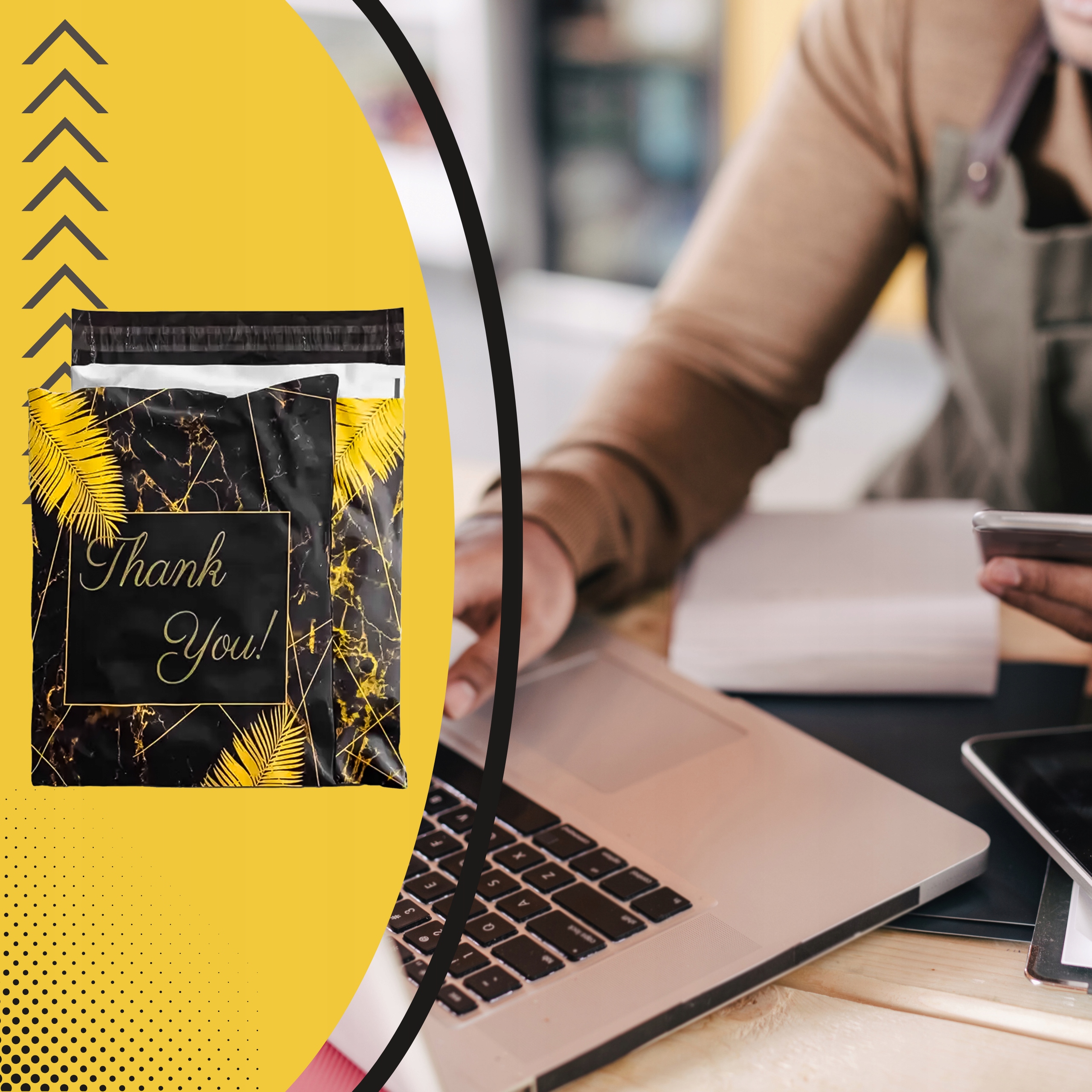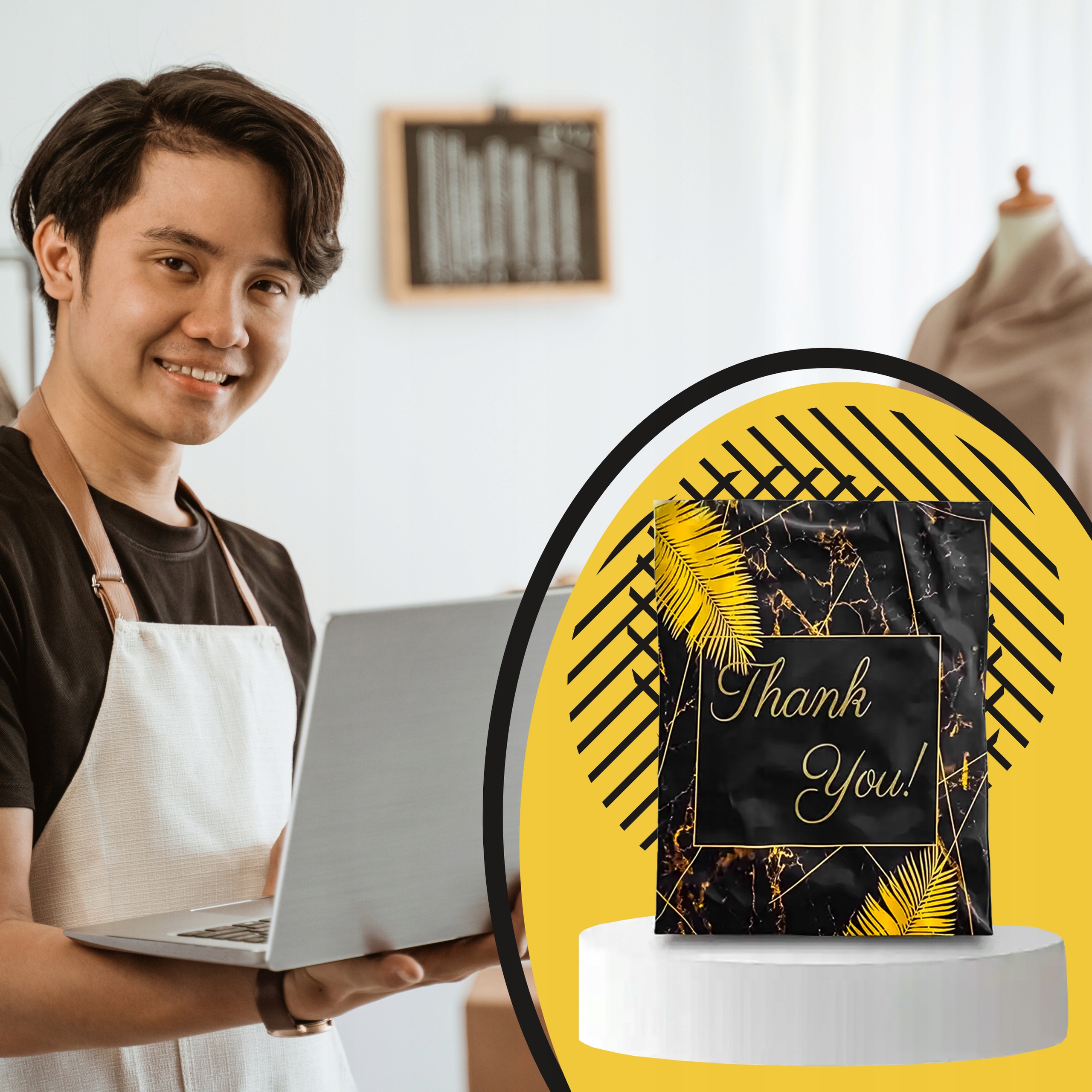 ✅ Колір/малюнок кур'єрського поліетиленового пакета: Чорний/золотистий з написом Thank You