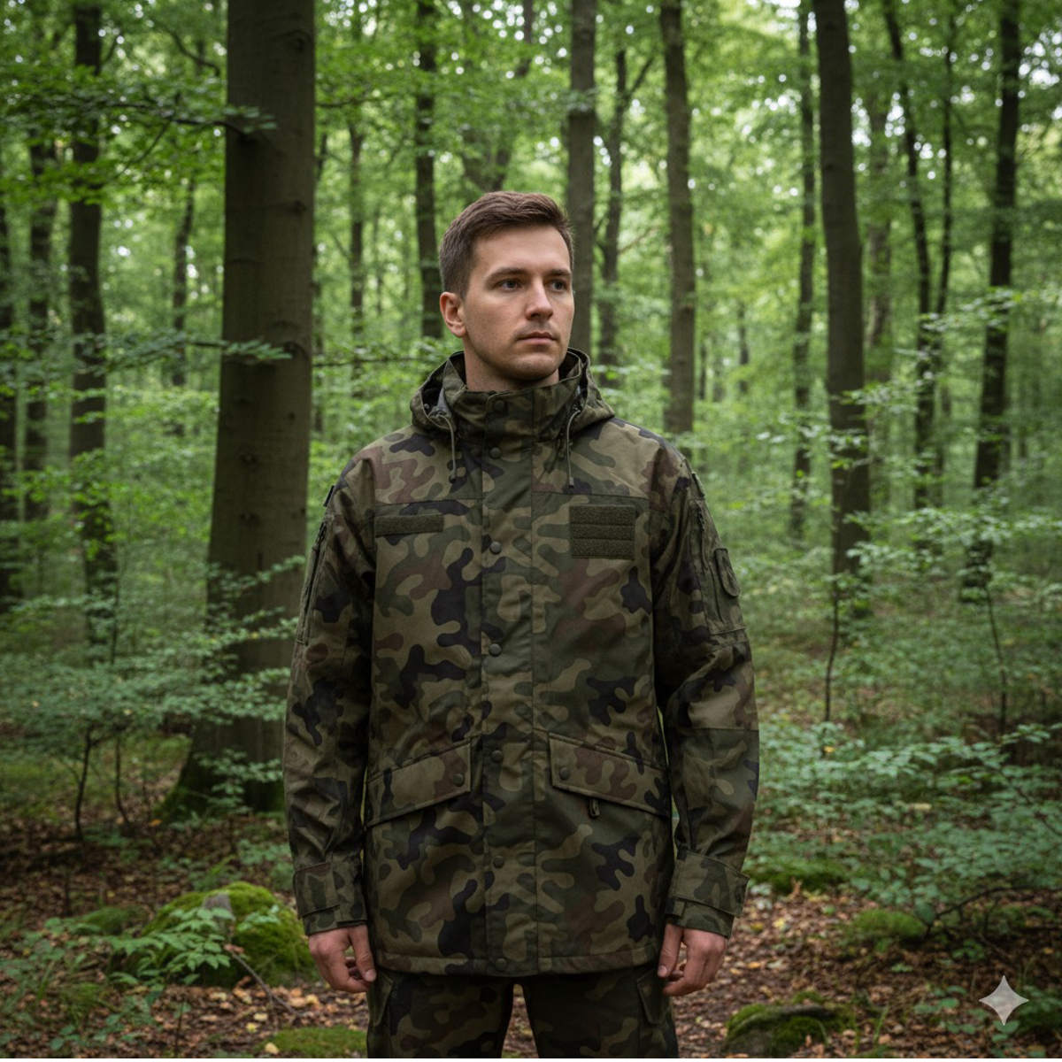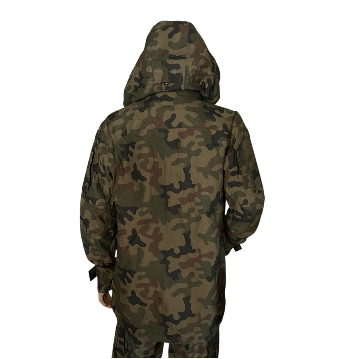 - Матеріал: тришаровий ламінат з двокомпонентною мембраною на основі PTFE з поліамідною тканиною кольору хакі з камуфляжним принтом «пантера» та поліамідною підкладковою тканиною