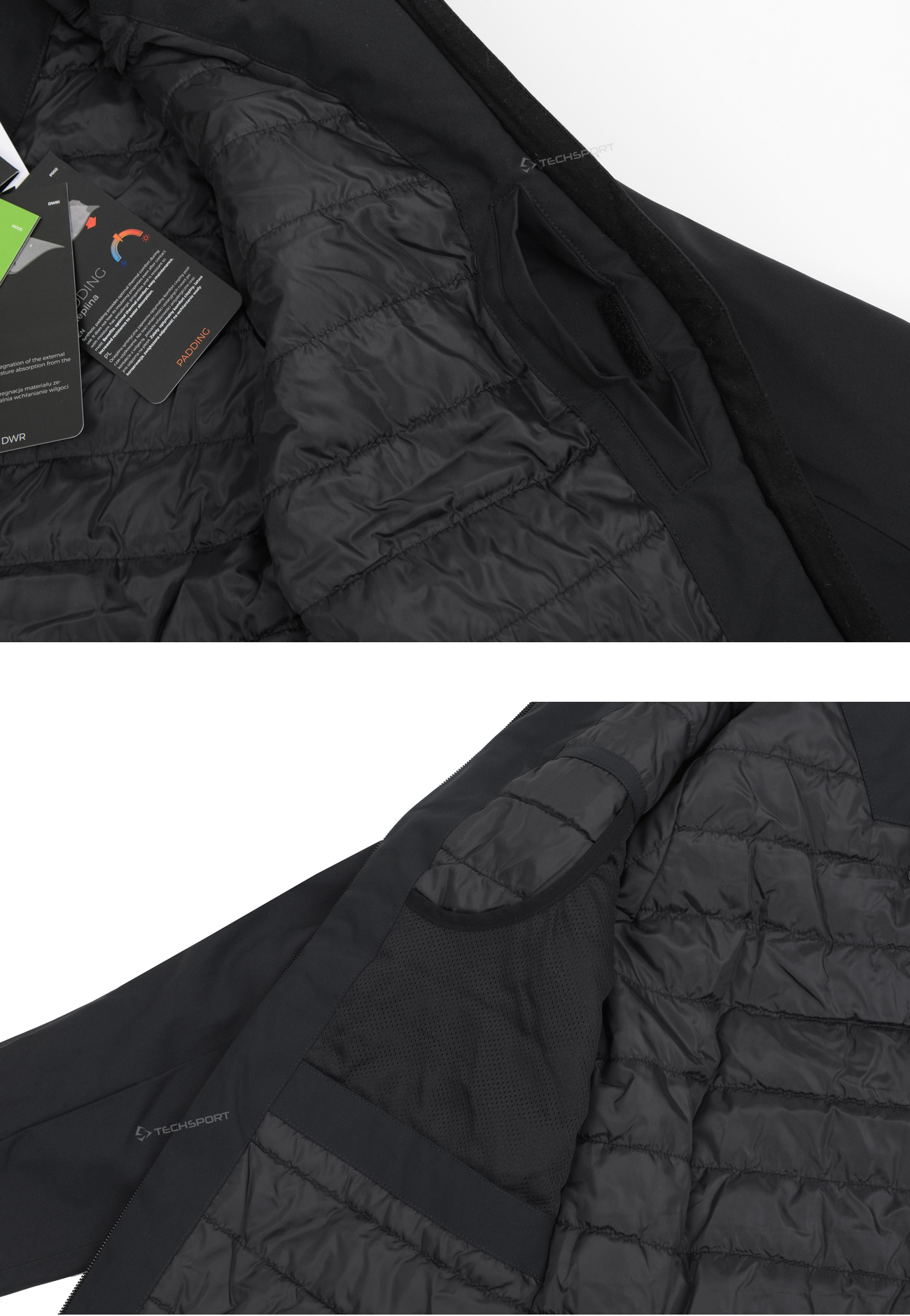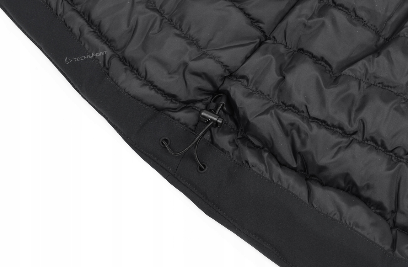 Куртка застібається на односторонню основну блискавку з внутрішнім вітровим клапаном, який обмежує проникнення холоду всередину куртки. Нижню окружність можна регулювати за допомогою тунельного шнурка зі стопорами.