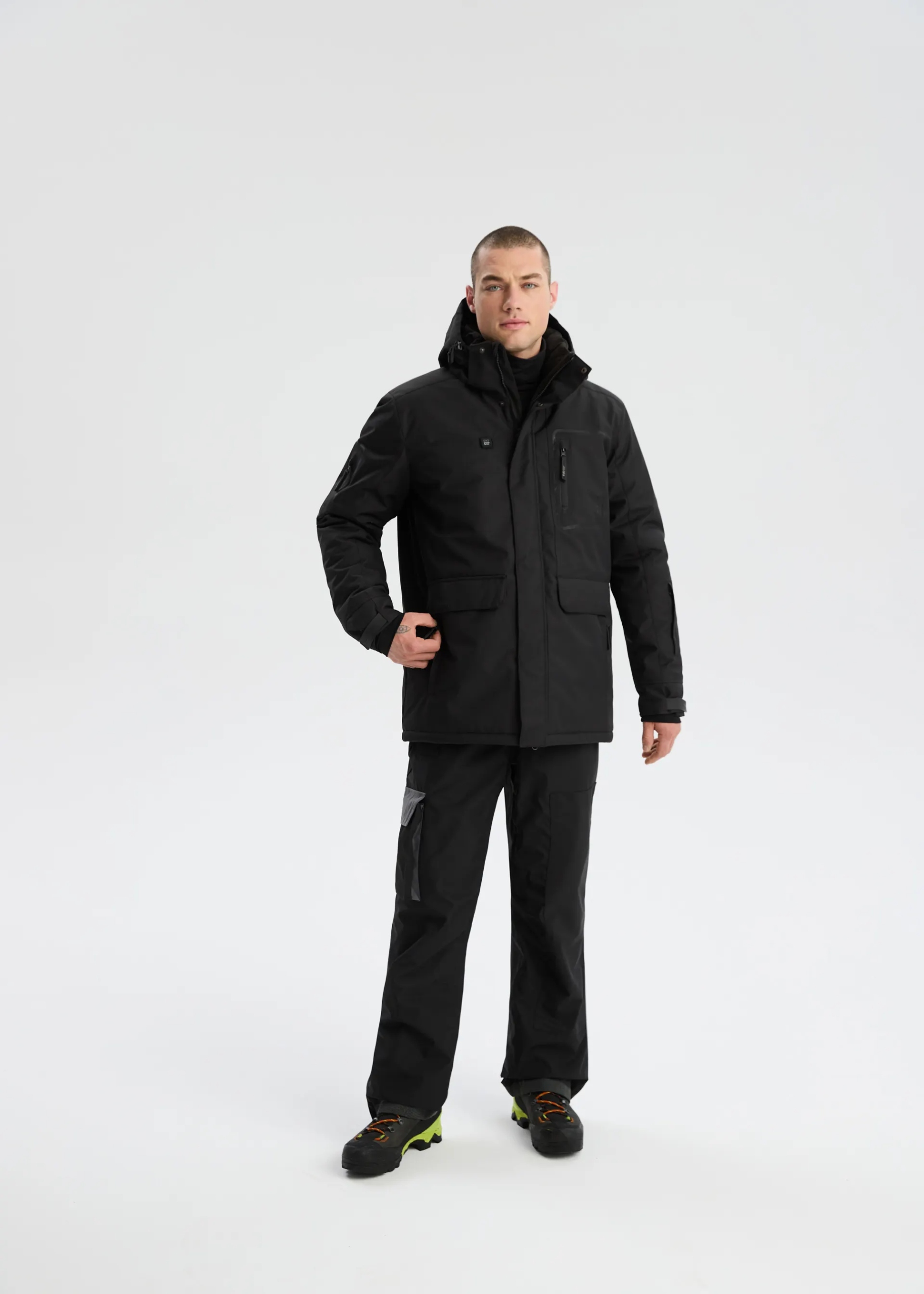 - інтегрована 3-ступенева система нагріву, розташована на задній панелі, живлення від powerbank, - знімний капюшон з високим коміром-стійкою, - трохи розширена форма, - водонепроникні блискавки, - сніговий пояс, - У часто використовуваних місцях матеріал прогумований для захисту від стирання, - регульований розмір манжети (прогумований і декоративний елемент на липучці), - синтетичний пуховий наповнювач, - внутрішні кишені, - шість зовнішніх кишень, в тому числі одна на плечі - застібаються на водонепроникну блискавку, - зовнішній матеріал із параметрами, які становлять зовнішній захисний шар від несприятливих погодних умов, - застібається на блискавку - біполярна робота, - сріблясто-червоний матеріал, розміщений на внутрішній стороні спини, допомагає утримувати та відбивати тепло.