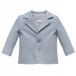 Елегантна куртка з колекції Чарлі виготовлена з бавовняної тканини в сталевому синьому кольорі. Підкладка піджаків зшиться з бавовняної тканини з ніжними сірими смужками. Він розстебнутий на 2 кнопки, і ми зшили 2 кишені спереду. Рулиці для піджака прикрашені 2 кнопками. Куртка з сорочкою та штанами Чарлі створить ідеальну стилізацію для хрещення або інших випадкових заходів. Він виробляється в Польщі і має сертифікат "безпечно для дитини". На фотографії модель заввишки 98 см і носить розмір 98.