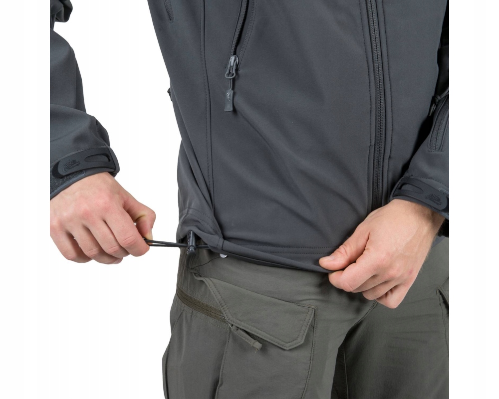 Helikon Gunfighter - це легка і дуже практична куртка софтшелл. Він виготовлений з 3-шарового еластичного матеріалу Shark Skin, який забезпечує чудову ізоляцію та захист від вітру та вологи, зберігаючи при цьому високий рівень повітропроникності. Зовні світшот покритий тефлоновим покриттям DuPont, яке захищає від бруду та води. Зсередини підбитий м'яким флісом. Куртка має сім кишень, потайний комір і регульований капюшон, вентиляційні блискавки під пахвами, липучки на манжетах і шнурок. Капюшон зручно регулювати, не виймаючи рук з кишень, за допомогою шнурків, захованих у нагрудних кишенях.