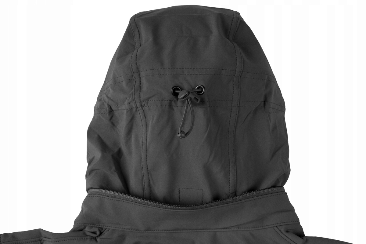 Куртка має місткий капюшон, захований у комір. Його можна регулювати, не виймаючи рук з кишень, за допомогою шнурків, захованих у нагрудних кишенях.