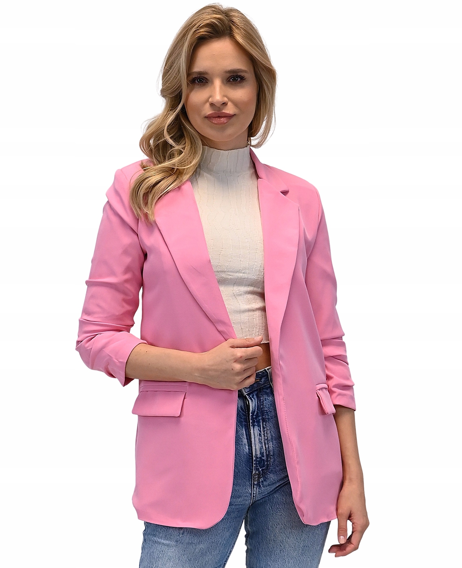 Довга модель, смокінг в тон елегантний і повсякденний стиль. Чудове доповнення до стилю для роботи, навчання або вечірнього виходу. Драпіровані рукава довжиною 3/4 додають оригінальний характер. Дві кишені з боків з ефектними клапанами прикрашають куртку. Вільний крій, з підкладкою та м’якими підплечниками.