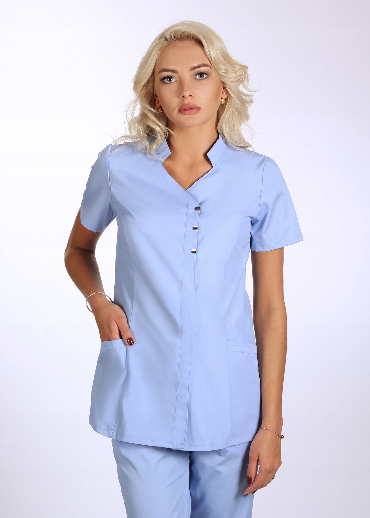 Куфта медична або косметичка найкраще поєднується з вузькими брюками. Застібки Schaffer, що дозволяють два варіанти вирізу. Французькі розрізи спереду моделюють жіночу фігуру. Дві кишені (ми радимо розмістити тут логотип компанії або зображення зграї).